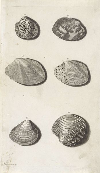 Editor: Right, so this is Wenceslaus Hollar’s "Schelp, hippopus hippopus," created sometime between 1644 and 1652. It’s an etching, currently held at the Rijksmuseum. There's something almost scientific, yet very beautiful, about the meticulous detail in these shells. What strikes you when you look at this, what do you see? Curator: You know, it whispers to me of a bygone era of discovery. It's not just about depicting shells, it's about capturing the world, piece by piece. These meticulous lines, each curve and ridge, they remind me of an age when scientific illustration *was* art, wouldn’t you agree? What if Hollar wasn't just rendering, but was also pondering the ocean’s vastness and the minute intricacies held within a shell’s embrace? Editor: That makes a lot of sense! So you're saying it's more than just observation, it is interpretation. Almost poetic! What did it mean to depict shells, anyway? Curator: I like to imagine patrons of that time gathering such images into albums and cabinets of curiosities. This artwork is evidence, then, not merely aesthetics, but about owning knowledge of the world, tidily organized and beautifully presented. Perhaps Hollar saw them as miniature maps of a hidden universe. Or maybe he simply loved their baroque flamboyance. Who doesn't find treasure on the beach? What’s the point of owning the sea if we fail to bring something to show for it. Editor: That connection between art, science, and collecting gives me so much food for thought. Thank you! Curator: My pleasure. Art history is all about tracing those threads. It's wonderful how a simple shell can reveal so much about a past era. It’s enough to inspire me to visit the ocean.
