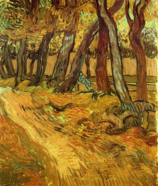Curator: Standing before us is Van Gogh’s "Garden with Weeping Willow," painted in 1888. Editor: There's an immediate rawness, isn't there? The landscape practically vibrates with those heavy strokes of color. You can feel the thick impasto, like you're stepping into the garden itself. Curator: Absolutely. It reflects Van Gogh's intense engagement with the physical world and his desire to represent subjective experience. The setting— likely a garden near Arles— speaks to the transformative power of landscape in his oeuvre, but is also, literally, garden-variety: these scenes are what he had ready access to. Editor: What strikes me most is his technique. The sheer physicality of the paint—each brushstroke, almost sculptural— transforms the ordinary into something almost… agitated. You know, I wonder where his paint tubes were made, what pigments were easily accessible at that time… Curator: An interesting question! Such a consideration might frame what kinds of landscapes are achievable through the markets. Still, the expressive distortion—particularly in that weeping willow— transcends mere representation. We can certainly say it anticipates later Expressionist tendencies. Art historians link the motif of the willow to themes of mourning and emotional turmoil during that time. Editor: True, but look at how the canvas seems almost woven together by these rhythmic, visible marks. He’s forcing us to confront not just the scene, but the very *labor* of painting it. It highlights this constant tension, one that resonates with much craft of the time as an art form trying to distinguish itself from industrial reproduction, something that arguably shapes the image’s status. Curator: An insightful connection, grounding it within that late 19th-century art world dilemma. Overall, viewing this work calls upon our sensitivity toward both visible, but also invisible elements that went into this striking, if rather quiet, picture. Editor: I agree completely! There’s a restless energy but also tranquility in the selection, processing and re-presentation of these basic materials and forms.