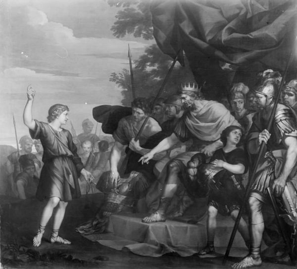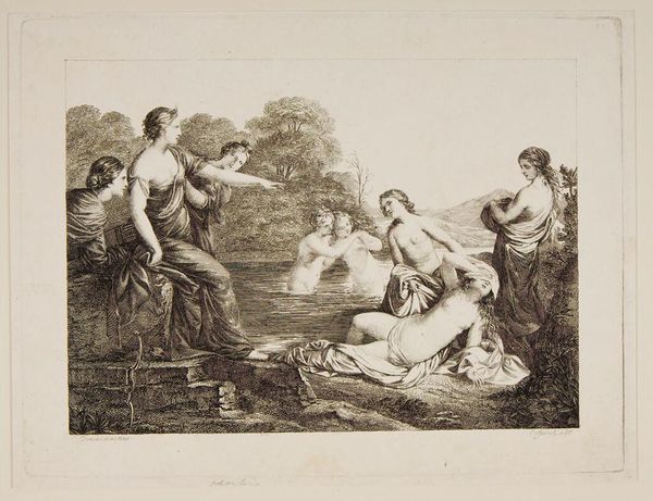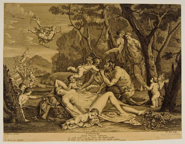 Curator: Immediately striking! So dynamic and with a great sense of impending doom. Editor: Indeed! We’re looking at “Latona Transforming the Lycian Peasants into Frogs,” a painting rendering a scene from Ovid's “Metamorphoses” by Hendrik Krock. It was produced sometime between 1686 and 1738 and currently resides here at the SMK. Krock has certainly captured a dramatic moment. Curator: The dramatic gestures, especially Latona’s raised arms, amplify the scene. Look at the shepherd’s arms raised to shield himself, and the twisting bodies… The symbol of metamorphosis, literally being turned into beasts for their transgressions. Editor: Absolutely, and transformation is such a rich theme. Frogs have always carried symbolic weight: fertility, transition, uncleanness. Considering this moment in light of political allegories which was rife at the time, how does such a visceral depiction underscore the hubris of commoners challenging the divine or noble? Curator: Well, Ovid’s tale itself reflects the sociopolitical landscape of his time, with the emperor embodying the divine authority. Krock's piece was created amidst struggles between the Danish crown and nobility—the peasant's fate could symbolize the perils of opposing those in power. Remember that artworks like this had a very public facing purpose at the time. Editor: True, history remembers those that wield power and leave indelible marks. See how Latona herself, though seemingly powerless, carries herself like the mother of Apollo and Diana! One can see the deep significance of motherhood as a link to future divinity or influence. The painting almost implies her act of revenge stems from a very natural, very powerful source: defending her children. Curator: An astute observation. Krock definitely captures the cultural reverence afforded to motherhood. He presents the tale as more than divine wrath—it's primal. Editor: Looking closer at the figures and the lush backdrop, I am captivated anew. The landscape itself feels… watchful, a silent witness to the eternal struggle between power and the powerless. It truly speaks volumes about our enduring need for symbols, archetypes, and moral lessons. Curator: I find myself wondering what other stories the museum may display along this one, I can only imagine the connections and contrasts we could discuss in turn.