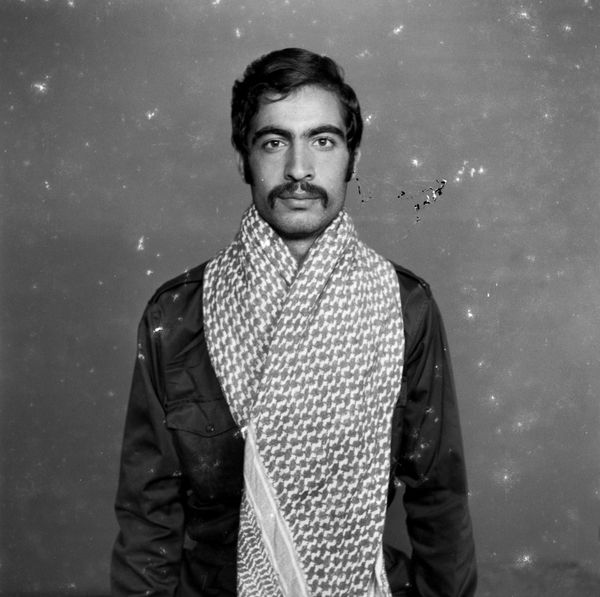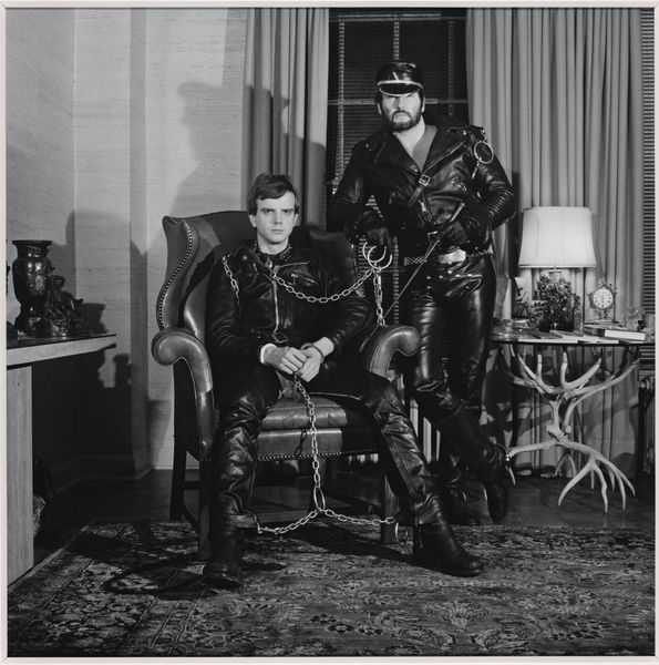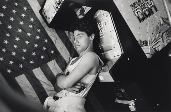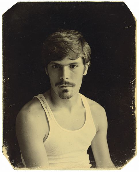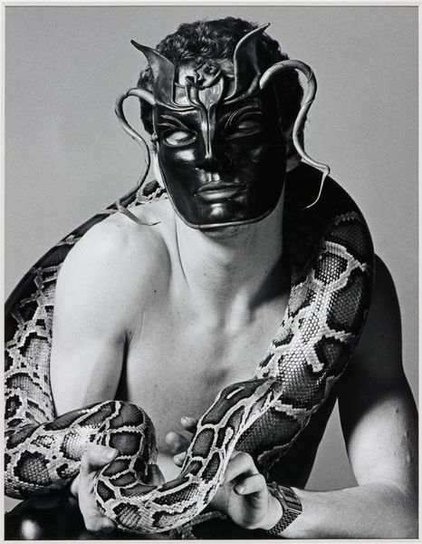 Curator: Robert Mapplethorpe’s photograph, titled "Nick," it's smallish, about a square foot, and lives at the Tate. What strikes you first about it? Editor: That skull tattoo blazing on his forehead. It's not just punk; it’s practically announcing: "I am a symbol!" Curator: Right? Mapplethorpe’s work often dances with symbolism. The leather jacket, the watch, the tattoos – they're almost hieroglyphs. Editor: There's a tension between vulnerability and defiance. The shadow behind him seems to amplify the vulnerability, while the studded belt screams the opposite. Curator: He’s crafted an image that's both deeply personal and deliberately constructed. It's an intense dialogue between the self and the gaze. Editor: Yeah, I walk away wondering what stories those tattoos hold. It's a potent, layered portrait. Curator: Absolutely. It's a whisper of something much larger.