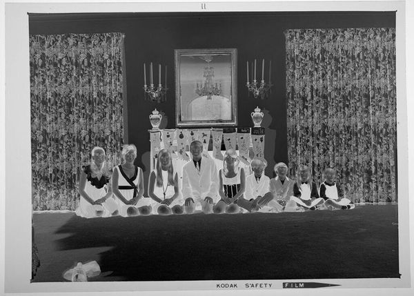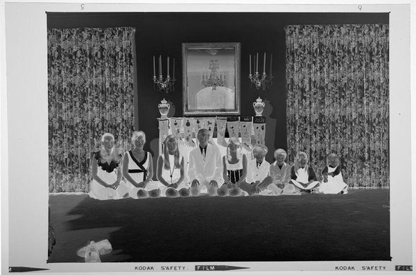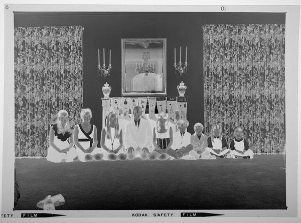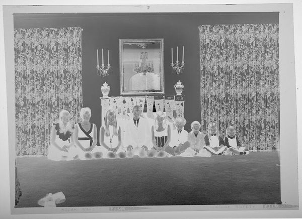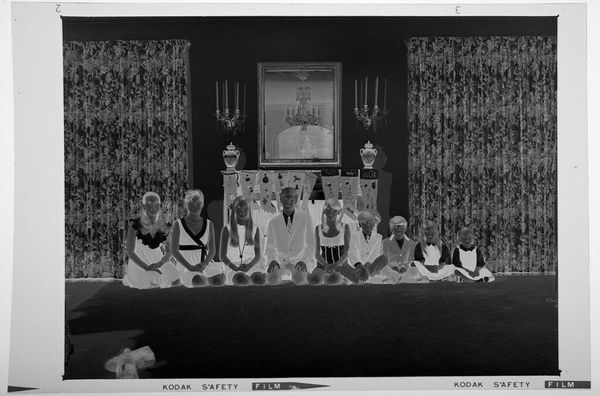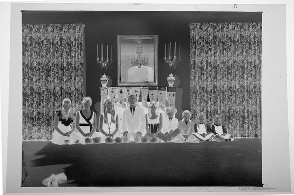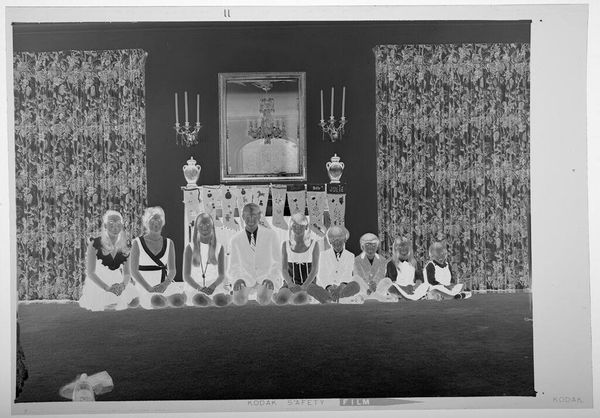 Curator: Martin Schweig's untitled photograph captures nine children posed before a Christmas fireplace. The image, a modest 6 by 8 centimeters, resides in the Harvard Art Museums. Editor: It has a distinctly formal quality despite the youthful subjects. The symmetry in their seating arrangement is compelling. Curator: Note how the composition emphasizes the constructed nature of the scene. The children, though individual, are unified by their placement. Editor: It seems the materials of the room itself contribute to this feeling, the manufactured decor acting as another player. Curator: Indeed, the backdrop—the curtains, the fireplace ornaments—functions almost as a theatrical set, underscoring the artifice. Editor: The image certainly reveals how domestic spaces are curated for the purpose of display and consumption. Curator: Precisely. The photograph, then, becomes a meta-commentary on presentation. Editor: So, we're left considering the materials of Christmas and family. Curator: I see a meditation on form and the staged tableau.