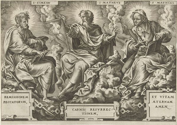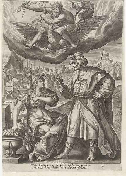 Curator: Flanking us today in gallery 225 is a stunning piece titled "Astrologia (Sterrenkunde)," an engraving realized after 1565. The print work is credited to Cornelis Cort. You'll find it nestled here at the Rijksmuseum. Editor: Immediately, I'm struck by its rather confident and assertive tone, given its dense and allegorical style. There's so much activity rendered through the precision of engraving, offering us both an abundance of information and sensory complexity. Curator: Indeed. Cort's creation presents an allegorical figure of Astrology, flanked by symbols of knowledge and instruments of cosmic observation. Look closely at how the artist blends scientific aspirations with mythological and landscape elements. What narratives emerge when viewing this work today? Editor: For me, this speaks directly to power. Here, astronomy, an early science used to justify class division and colonial control, is glorified and celebrated. The composition feels inherently unequal—a celestial, winged goddess sits at center stage, while an old sage shares the picture, assisting in understanding the earth's spheres, yet his positioning behind suggests subordination. Curator: Interesting. Consider then how such depictions were received within 16th-century European intellectual circles. Engravings like these democratized knowledge; disseminating scholarship and worldview from the few to many through accessible and affordable visual media. Is democratization inherently a force for positive change? Editor: I agree that accessibility matters. At the same time, we should always scrutinize how and by whom knowledge is being presented. Whose versions of history and "truth" are becoming popularized? If these images normalize power dynamics—for example, that only old men have expertise—are we making true progress? Curator: I appreciate your call for constant interrogation of systems, regardless of how knowledge is dispensed. The composition here invites us to consider where power resides. Whether divinely inspired or rationally deduced, the artwork speaks to humanity's enduring desire to map our place in the cosmos. Editor: And while our understanding has evolved vastly since Cort’s time, that basic yearning for meaning, understanding, and maybe control, remains constant. Looking at "Astrologia," one must consider that visual culture never just passively reflects the dominant order; it plays a part in actively creating and solidifying it. Curator: That’s a critical point—power isn't just portrayed, it is performed. The image here has not only served as a window to early scientific aspirations but perhaps as a mirror reflecting ourselves.