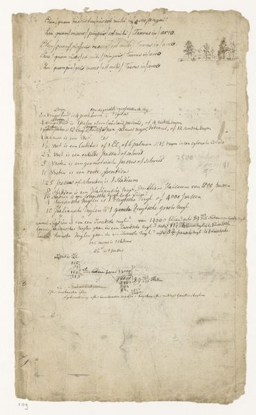 Curator: This work, dating from around 1660, is entitled "Sketches of Weapons and a Group of Chinese People". It is attributed to Wouter Schouten, crafted using ink on paper. Editor: The initial impression is of something quite fragile, ephemeral almost. The faded ink lines sketch a scene, and give the eye enough to see that the central theme revolves around war artifacts and oriental characters. Curator: Yes, and what interests me particularly here is situating the drawing within the history of Dutch Golden Age Orientalism. Schouten, after all, traveled to Asia as a surgeon for the Dutch East India Company. This piece could provide visual context for colonial narratives and how "the other" was represented in the Dutch collective conscious. Editor: I see what you mean. The spears, the muskets, and other bladed instruments are positioned, in relation to each other. The artist creates an index of Western power as seen in those instruments that conquered and exploited Eastern lands and cultures. It's very telling. What do you observe of the group of "Chinese People?" They seem meekly drawn and blurred to contrast these implements of conquest. Curator: Exactly. Note also how the sketches lack detailed facial features. This lack of individuality, as seen in their clothing, echoes prevalent stereotypes and suggests how Dutch traders othered foreign people within economic systems fueled by racist structures and cultural appropriation. Editor: The objects speak volumes; they create that hierarchy for the viewer immediately. They appear as imposing dark blots, casting their long shadow into history. I’m also noticing now some written annotations as well. Do we know what they reference? Curator: Unfortunately, not yet, though studying this further to give further context about Dutch engagement within Asia is compelling in regard to contemporary post-colonial analysis. It certainly compels critical engagement to analyze art during that time. Editor: Yes, precisely, to acknowledge the symbols of oppression that linger beneath a seeming innocuous drawing allows us to approach these moments with mindful consideration.