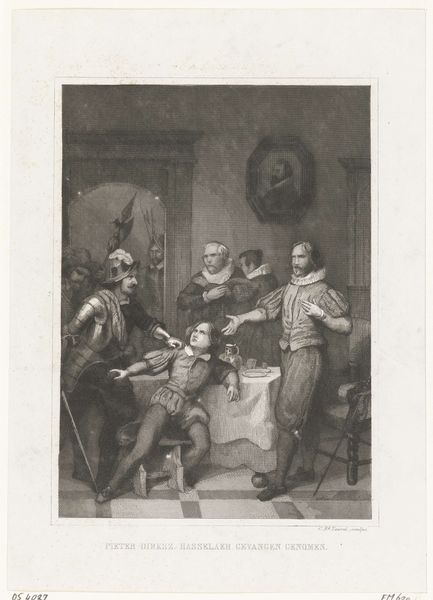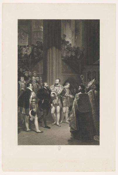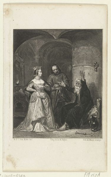 Franciscus Bernardus Waanders created "The Governor of Zeeland and Saphira" around 1874 using an engraving technique. Waanders created this scene during a period of intense nationalism and historicism in the Netherlands. The artwork depicts a powerful man, presumably the governor, flanked by advisors, while a woman kneels before him, begging. Waanders invites us to consider the dynamics of power, gender, and morality within a 15th-century context. The governor’s stern expression and the supplicant’s posture suggest an uneven exchange shaped by gender and social status. The image creates a space to examine the historical treatment of women and the complex negotiations of power. By highlighting this emotional scene, Waanders encourages a reflection on the universal themes of justice, mercy, and the individual's struggle against authority, inviting contemporary audiences to reflect on power dynamics in their own lives.