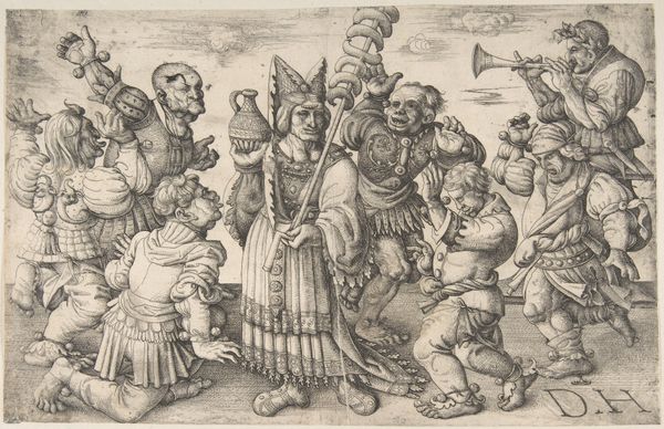 Curator: Here we have "Procession of Monstrous Figures," a striking engraving created around 1615 by Wendel Dietterlin the Younger. Editor: It strikes me immediately as grotesque. The expressions are exaggerated to the point of caricature, almost repulsively so. Curator: Indeed. Dietterlin, working firmly within a Mannerist aesthetic, distorts the human form, employing elongated noses and bulging eyes. He revels in complexity of line and the overall composition—note the way the figures seem to spill out of the frame. Editor: And it's interesting how these grotesque features seem at odds with their finery—these are monstrous beings clad in detailed garments. Consider also that it's an engraving: a meticulous, labor-intensive printmaking process intended for relatively wide dissemination. What does it tell us about the viewing habits of the day, about who this was made *for*? Curator: That's an excellent question. The density of the visual information here suggests an elite audience, viewers capable of decoding this. There's also a playful element. Caricature, at the time, often served a moralizing function but within a carnivalesque atmosphere. It almost has roots in commedia dell'arte. Editor: I agree; it points to an enjoyment of inversion, of a material reality subverted. We’re witnessing bodies that carry themselves with a strange, and maybe defiant, dignity, even as they display bizarre deformities. The materiality of those deformed bodies feels…pointed. Is it just moral commentary, or is there a sense of empathy there too? Curator: A fascinating proposition! I hadn't considered empathy so explicitly here, though the carefully rendered detail perhaps invites it, slowing our gaze. Dietterlin certainly doesn’t shy away from the labor involved, inviting careful inspection and encouraging repeat viewings. Editor: So, not just a glance, but an encounter. To linger is to meditate on who makes up "society" and, critically, on whose image it excludes, whether due to actual deformation or perceived monstrosity based on class or labor. Curator: Yes, perhaps this ‘procession’ asks us not only to recoil but also to reflect upon our own judgments. It prompts consideration of our societal definitions of 'normalcy', viewed through an extraordinary level of precision within each stroke of line. Editor: Definitely a complex and provocative image. It pushes the boundaries of representation and taste. Curator: A journey into both skill and spectacle. Dietterlin challenges us with just how strange 'familiar' visual representation can be, given certain formal twists.