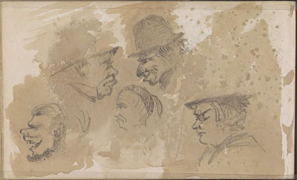Editor: This is Washington Allston’s "Group of Heads, for 'Christ Healing the Sick'," and it looks like a pen and ink sketch. The faces seem really intense; what strikes you about this preparatory drawing? Curator: Considering the title, I see a study of the human condition, particularly in the context of suffering and hope. Allston, working in the early 19th century, was deeply engaged with Romanticism and its emphasis on emotion. Do you see how the faces, though quickly sketched, convey a range of emotions? Editor: I do, now that you mention it. It feels like a study of different reactions to a miracle, perhaps? Curator: Precisely. Allston might be exploring how social roles and identities – hinted at through the varied head coverings and facial features – shape our response to moments of crisis and potential healing. It's a powerful meditation on the intersection of faith, society, and the individual. Editor: That gives me a lot to think about; I hadn't considered how social roles might be at play. Curator: It's in those nuances that art history becomes truly compelling.