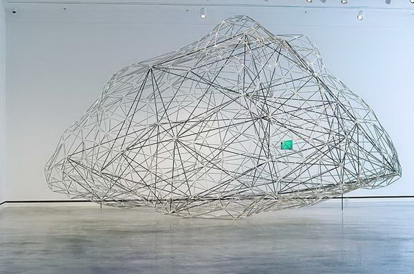 Kenneth Snelson's V-X is made of metal, and looks like some kind of futuristic building block or playground equipment. The cool thing about sculpture is you can really see how it's put together, which means you can get a sense of the artmaking process. The steel tubes balance and pull against each other. The thin metal cords make the whole thing feel like a drawing in space. The way those elements come together makes you think about how things can be simultaneously solid and fragile, or heavy and weightless. Look at how one of the tubes plunges into the ground at a steep angle. Does that give the work a sense of thrust, or does it feel precarious to you? Snelson's work reminds me a little of Sol LeWitt's modular sculptures, where simple geometric forms add up to complex arrangements. But where LeWitt can feel very cerebral, Snelson has a sense of play to it. It's like he's saying, "Hey, let's see what happens if we try this." And that's something I can really get behind.