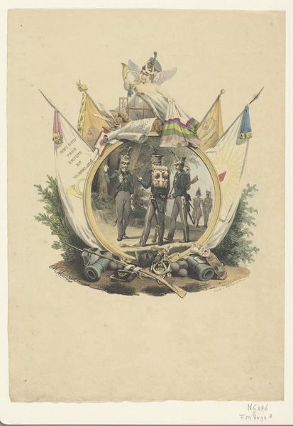 Editor: We're looking at "Gedenkplaat bij de novemberfeesten in 1863", a print by August Allebé, created in 1863. It feels incredibly dense, like a memory palace crammed onto a single page. What really jumps out at you in this intricate commemorative plate? Curator: Oh, it's a glorious visual feast, isn't it? For me, it whispers tales of national pride and remembrance. The wreath-like composition feels significant. It’s holding fragments of history—moments in time almost frozen like flies in amber. Don't you think the juxtaposition of smaller scenes around a larger central image suggests the many facets that build a national identity? Editor: That makes sense. The way you describe the central image really brings its complexity to life. So, how would the November festivals influence this type of composition? Curator: I think the "November feesten," the November festivals are the key. They were celebrating major historical turning points. Consider how Allebé layers those events - it’s not just chronicling history; it's orchestrating collective memory! But does the density perhaps strike you as…overwhelming? Editor: It definitely feels like there's a lot to take in. I can't imagine how the public felt about it when it first came out, but, that visual overload speaks to a period brimming with both excitement and maybe anxiety too. Curator: Precisely! And art like this, it isn't merely reflective but deeply participatory. In that, the image and cultural identity continue to play off one another, creating echoes through time! I love thinking about how we still perform that kind of work with our images today. Editor: Absolutely. I initially just saw detail, but now I am beginning to recognize echoes. Thanks for pointing them out!