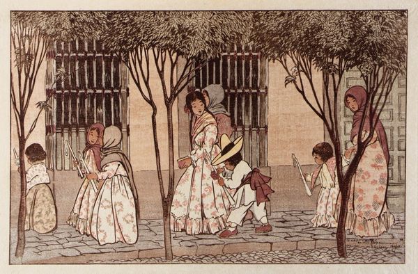Curator: The eye is immediately drawn into a crowded street scene, but the overall mood is surprisingly calm. Editor: Indeed. What we're looking at is Utagawa Toyoharu's "Perspective View of Shin Yoshiwara in the Evening," an ukiyo-e woodblock print likely from the late 18th century. Curator: That converging perspective lends the work a sense of depth, almost pulling the viewer into the Yoshiwara district. I wonder, was Toyoharu consciously using Western perspective to depict this "floating world?" Editor: Absolutely. Ukiyo-e artists were fascinated by Western art's techniques and incorporated them to appeal to a broad audience interested in novelty. Shin Yoshiwara itself was a constructed space, a pleasure district shaped by socio-economic forces. Curator: I see the architecture framing the human activity like a stage. The soft colors, the muted palette, even the anonymous faces seem to highlight the collective experience, the symbolic weight of desire and entertainment. Editor: The sheer number of figures also reflects Yoshiwara's vitality and its economic significance in Edo society. It's a fascinating snapshot of a very specific place and time. Curator: So, in a way, the image captures both a real location and a shared cultural fantasy. Editor: Precisely. By blending traditional Japanese printmaking with Western perspective, Toyoharu not only captured a place, but also a moment of cultural exchange.