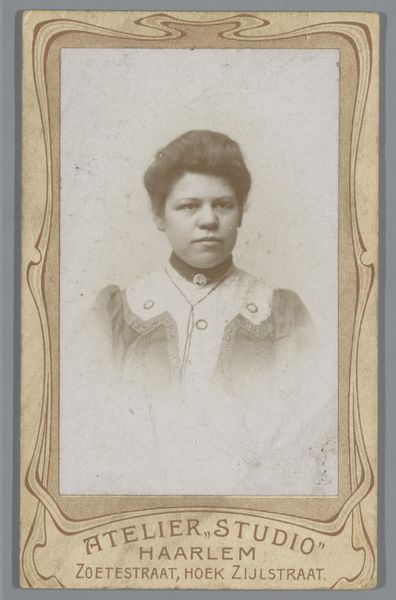 Editor: This gelatin silver print, “Portret van een onbekende jonge vrouw” by Jannes Faber, strikes me with its delicate texture and how the subtle color adds an element of intrigue to the image. What can you tell me about how this portrait came to be, particularly considering its materiality? Curator: A crucial lens here is the socio-economic context. This work produced sometime between 1897 and 1909 invites us to consider the rise of affordable photographic portraiture. Instead of the exclusive realm of painted portraits for the wealthy, we have this mass produced, hand-tinted image for someone of a more middle-class background. How do you think that shift might affect the sitter's sense of self or social standing? Editor: That's interesting! It's easy to forget how photography democratized portraiture. Do you think that affects how Faber approached the process as a photographer? Curator: Absolutely. Faber, in signing and presenting his work as 'Photo-Teekenaatelier,' blends photographic and traditional artistry, hinting at the tension and perhaps, a striving for higher artistic standing during photography's acceptance as fine art. This blending highlights the labour involved – from setting the shot to hand-coloring the print, challenging traditional notions of "artistic genius." What impact do you believe this has on the object’s overall value, socially and economically? Editor: So the value isn’t just in the final image, but also in understanding the processes, the materials, and even the economic accessibility that it offered? I’ll definitely remember to consider the means of production for other works too! Curator: Precisely! Recognizing that interplay opens doors to richer interpretations of both the art and its role in the world.