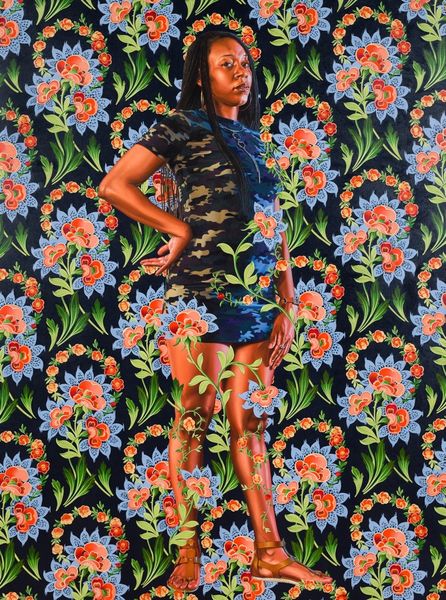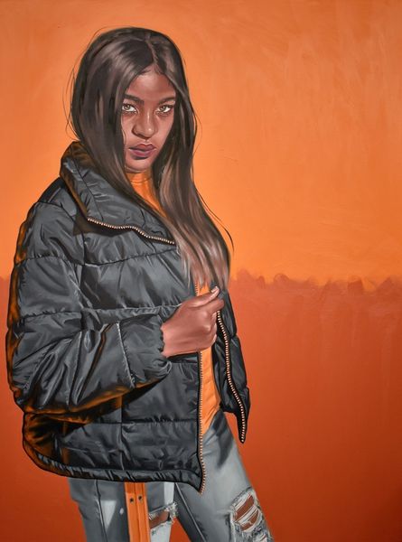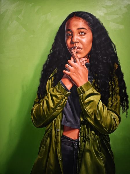 Monica Ikegwu painted "Shannon," with oil, no date is listed. The tones are primarily blue, a cool harmony that feels calm, but also intense, because, well, the whole thing is blue. It gives me the feeling of being underwater. Looking at the surface, I can see the artist has used thin layers of paint to give the impression of light falling across fabric. Check out the way light hits the folds of the fabric behind the figure, and notice how this same quality is captured in the denim of the overalls. It’s so smooth, almost like glass in some areas. That contrast between the hard surface of the denim and the softness of the skin makes me think of Alice Neel, who always managed to bring out the humanity of her subjects, even with just a few brushstrokes. In the end, that is what makes art so interesting, it leaves a lot open to interpretation.