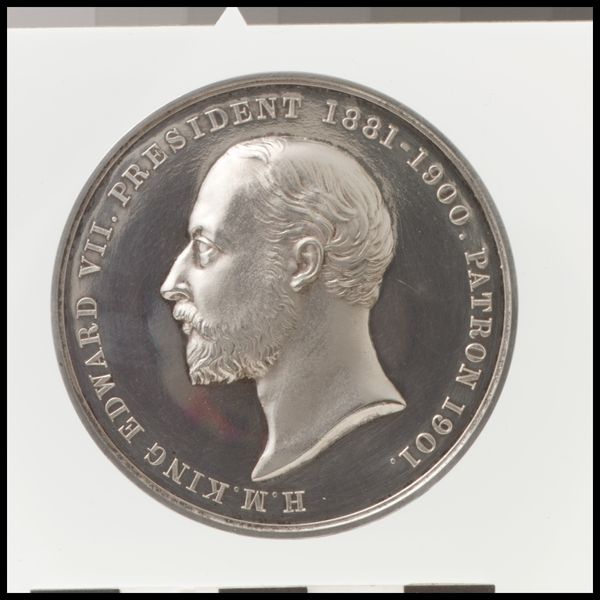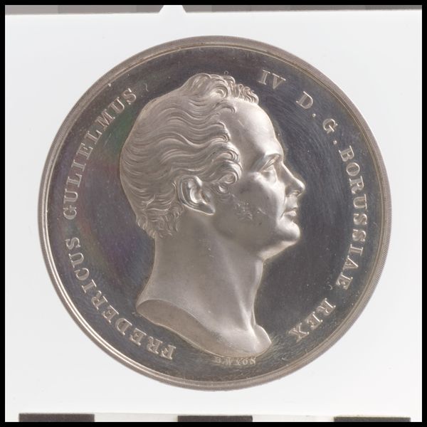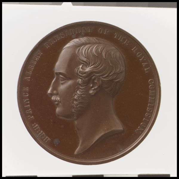 Curator: This metal relief sculpture, titled "Sir Francis Chantrey," was created in 1846 by William Wyon, and it now resides at the Metropolitan Museum of Art. It's a striking Neoclassical portrait medal. What's your first impression? Editor: Stark. Severe, even. The metallic sheen combined with the profile portrait gives it a sense of cold authority, almost Roman in its gravitas. Curator: That's a great observation. As a medal, this object would have served multiple purposes. Certainly commemorating Chantrey, who was himself a noted sculptor, but also participating in the broader culture of recognition within artistic and scientific circles. I’m curious about how its creation intersects with the labor of the mint and the economic systems supporting these artistic endeavors. Editor: And the choice of imagery is potent. The profile itself immediately invokes the classical world, echoing coins of emperors and philosophers. His balding head and severe expression suggests wisdom, discipline... perhaps a hint of the struggles inherent in the creative process. It's loaded with symbols of achievement. Curator: Interesting. I find the materiality just as compelling. The precision of the relief speaks to advanced techniques in metalworking and die-cutting. Consider the labour that went into creating the die! Moreover, such items often functioned within elaborate systems of patronage and exchange. The very material, the metal itself, carries an inherent value. Editor: True. And beyond the intrinsic value, there's the conferred status. A medal like this serves as a potent symbol of recognition. It carries cultural weight beyond the individual portrait. The act of awarding it elevates both giver and receiver. The visual language cements a certain cultural narrative of artistic excellence. Curator: Precisely. Reflecting on it, I'm drawn to how it encapsulates the relationship between the artist, the patron, and the wider social value placed on artistic skill within Victorian society. Editor: For me, the artwork’s evocative imagery creates an enduring monument to artistic legacy, sparking thoughts about the nature of fame and the cultural stories we choose to tell through symbols.