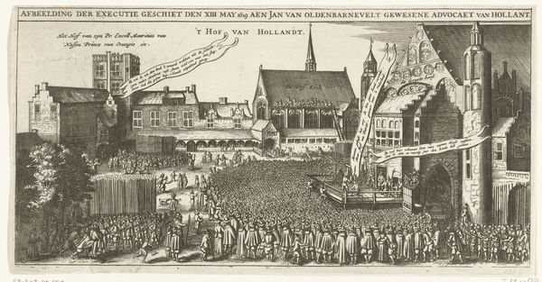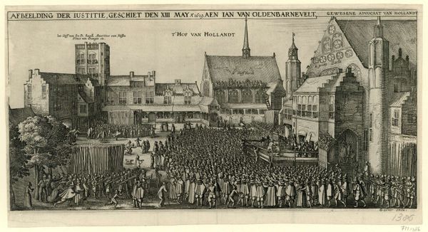 This is a 1619 print depicting “The beheading of Johan van Oldenbarnevelt,” created by an anonymous artist. Consider the Dutch Republic in the early 17th century, a period marked by religious and political conflict. Oldenbarnevelt, a key figure in Dutch politics, was executed for treason amidst a power struggle between religious factions and tensions with the ruling House of Orange. The print captures the spectacle of public execution, reflecting the era's attitudes towards justice and power. The crowd is rendered with a detailed and graphic nature, which was meant to serve as a warning, as well as political propaganda. The choice to depict this event through printmaking also suggests an effort to disseminate a particular narrative widely. As we reflect on this image, consider how it immortalizes a moment of political violence and manipulation. What does it mean to create a spectacle of justice? This print leaves us to consider the intersection of power, politics, and public perception.