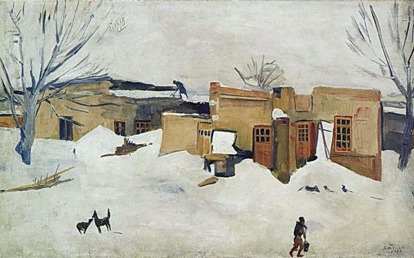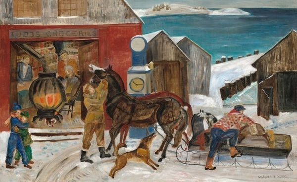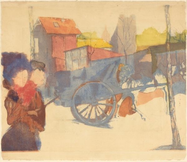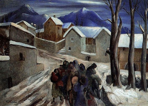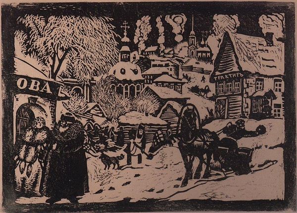 Editor: So, here we have Aleksandr Deyneka's "Winter in Kursk" from 1916, a watercolour piece. It's… teeming! It’s a busy market scene, but rendered with this wonderfully soft palette. What captures your attention when you look at it? Curator: That's a keen observation! I’m struck by how Deyneka uses a limited palette to evoke the feeling of a cold, overcast day. Notice how the muted browns and greys create an atmosphere that is heavy with…waiting. The flurry of activity, the horses, the people... it's almost dreamlike. And you get the sense he is both part of this crowd, observing this intimate space, yet somewhat distant. What do you think this kind of viewpoint adds? Editor: I see what you mean. It does feel like a memory, faded at the edges. The aerial perspective makes it feel vast, despite the muted colours. Do you think the historical context – 1916, during World War I – plays a role in the tone? Curator: Absolutely! Despite its depiction of daily life, there's a tension beneath the surface, don’t you feel? Kursk wasn't a frontline city, but the war would have been palpable. I imagine the artist may have tried to evoke a sense of humanity persisting amidst the chaos and uncertainty of wartime through a celebration of human activities, with intimate scenes in busy market environment. Editor: It definitely adds a layer of depth to it, understanding that context. Curator: What do you make of it as an observer then, someone encountering it anew? Editor: For me, it initially felt simply like a scene but considering that 1916 context has made it much deeper. Like you say, it becomes not just a fleeting vision of market day but also captures humanity amid those uneasy, historical times. It’s not about glorification but gentle depiction! Curator: Precisely! It's a dance of the personal and the historical, captured in watercolour and light. Beautiful, isn’t it?