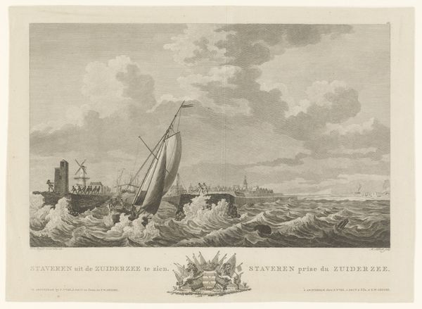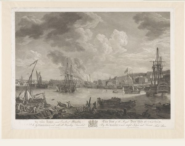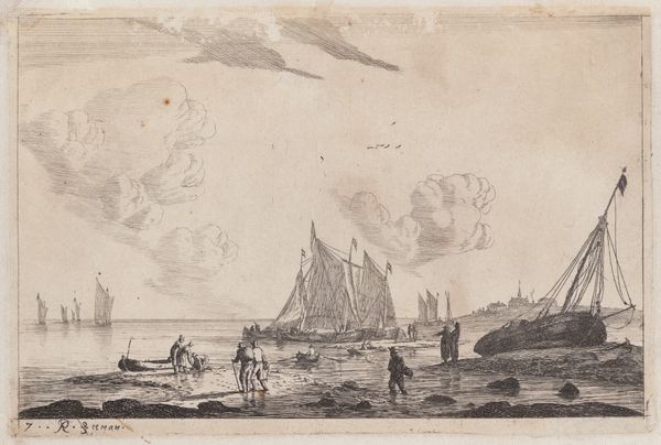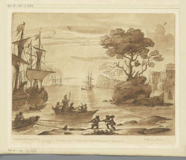 Curator: Up next is "Vissers in een mediterraan kustlandschap," which translates to "Fishermen in a Mediterranean Coastal Landscape." This etching and engraving by Pietro Antonio Martini dates to sometime between 1748 and 1783. Editor: The muted grays create a serene, almost melancholic mood. It feels… timeless, even though I know it's centuries old. It’s beautifully composed; the way the coastline curves draws the eye right into the scene. Curator: Absolutely. The light, in particular, directs us through symbolic layers. See how the fisherman, almost like a figure from classical mythology, is situated closest, drawing a line from this foreground towards a distant cityscape? Light emanating from that port suggests safe harbors and return. Editor: And the ordinary people… the fishermen, the figures in boats, all performing their daily labor near what seems like a looming stone edifice. To me, it highlights the complicated relationship between humanity and the natural world. And whose "safe harbors" were really being prioritized by 18th-century society? Curator: That tension between the built environment and the natural is something Martini repeatedly explores. The lighthouse stands as a powerful, unwavering structure amid the potentially chaotic sea. But its architectural details mimic the classical structures favored during this period, embodying continuity. Perhaps safety is an agreed social concept, dependent on historical precedents, rather than pure geography? Editor: Perhaps… it makes me consider issues around coastal access then and now, class, privilege... even who gets remembered in history and how that’s framed. Those subtle details of daily life become so significant. Curator: For me, the engraving, so precise in its lines, creates an evocative image. The detail—from the clouds to the ripples on the water—speaks to something universal. Even today, the rituals associated with the sea offer us glimpses into the continuity of human experience. Editor: I find myself dwelling on who isn't visible, and the unacknowledged narratives of marginality beneath these serene, picturesque scenes. A reminder that the visual symbols only carry certain messages to some eyes, but obfuscate or omit the true realities of a shared experience. Curator: That tension—between what is depicted, and what lies concealed—undeniably resonates. Perhaps our collective cultural memory always requires an element of imagining the invisible alongside the seen. Editor: Precisely, prompting us to acknowledge the past, challenge the present, and broaden who gets access to that continuity in the future.