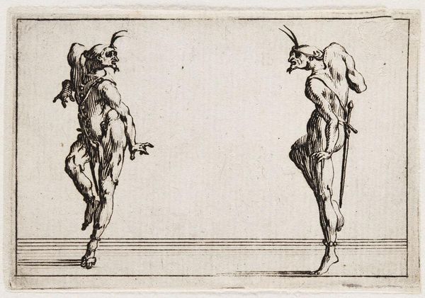Curator: Here we have Jacques Callot's "Two Pantaloni Turning Their Backs," a small etching from the early 17th century. The print showcases two figures in Commedia dell'arte costumes. Editor: They're so bizarre! Like nightmare ballerinas… all spindly limbs and grotesque masks. There's a weird sort of energy, though. Curator: Callot was a master of etching, and his process involved using hard ground and échoppes to create incredibly fine lines and details. The material reality of printmaking allowed him to disseminate images widely. Editor: It's fascinating how he captures movement with such simple lines. They almost seem to be mocking us. Or maybe just the sheer absurdity of existence… Curator: Indeed, and the costumes were meticulously rendered, providing insights into the fashion and social status depicted in Commedia dell'arte at the time. Editor: I find that both hilarious and disturbing, the way they're turning away. It really gets under my skin in the best possible way. Curator: Well, through Callot's craftsmanship, we gain understanding of period performance and the labor that went into producing these images for circulation. Editor: Maybe that's the real trick: Callot has us looking in both directions at once. It leaves you a bit breathless.