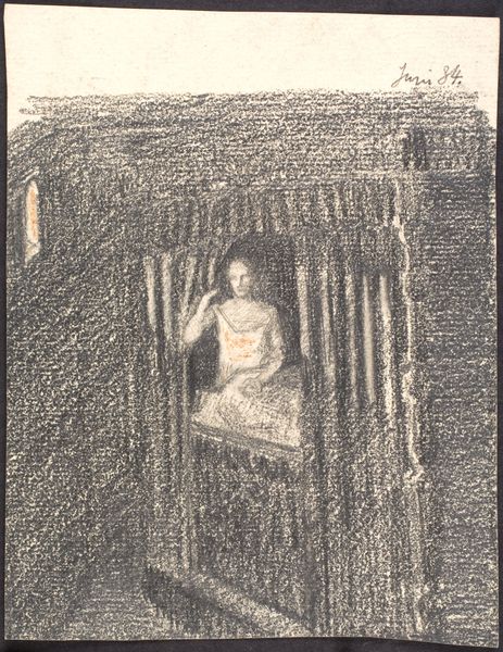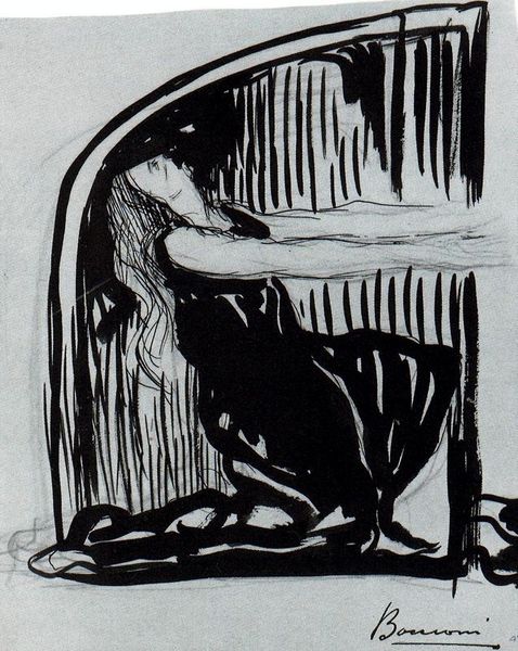 Editor: We are looking at Francis Bacon’s 1961 charcoal drawing, "Crouching Nude". It’s quite unsettling. The figure is confined by harsh lines and seems to almost melt into the space. What formal elements stand out to you? Curator: Note the dominance of the monochromatic palette. This reduction in color, paired with the stark contrast between light and shadow achieved with the charcoal medium, focuses the viewer's attention on form and texture. Consider how Bacon has structured the space, with these geometric shapes acting almost as a cage. How do these formal arrangements affect your reading? Editor: I see what you mean about the geometric structure acting as a cage – it feels like the figure is trapped not just within the space of the drawing, but by the very composition itself. The distorted rendering of the human form emphasizes this tension further. It’s a portrait, yet the distortion pushes it towards abstraction. Curator: Precisely. Now, consider the lines themselves. They are frenetic and broken. This emphasizes a sense of instability. The textural variation achieved through the charcoal – smudging versus sharp definition – further disrupts a smooth reading of the figure. There's a constant push and pull between representation and something less literal. What would you say about the effect that has? Editor: That push and pull makes it intensely dynamic. It stops the viewer from settling on any one interpretation. Curator: Indeed. The drawing transcends a mere representation of a nude figure, instead becoming an exploration of form, space, and the potential for abstracting the human condition through masterful manipulation of medium and line. Editor: I now see it's about disrupting our understanding of portraiture, prioritizing emotional impact through its distorted forms and stark lines. Thank you!