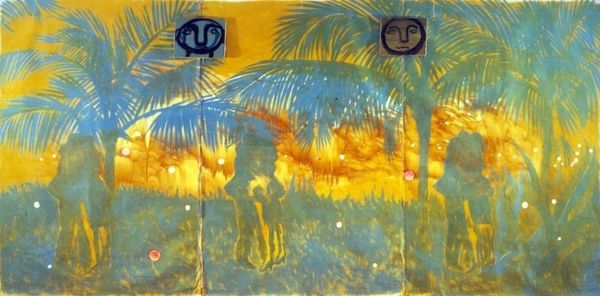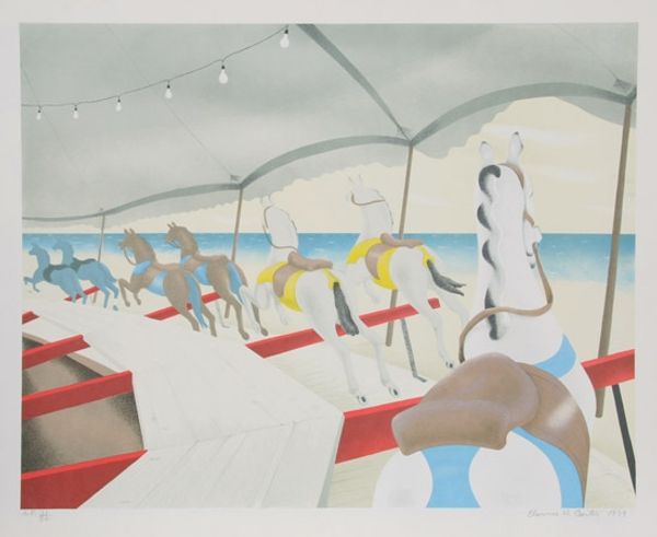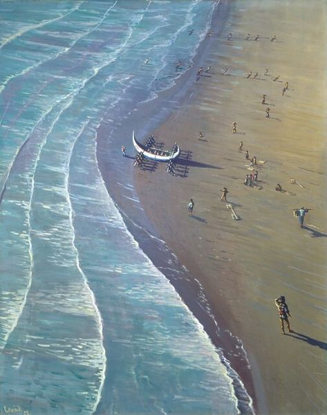 Editor: So, this is Frank DiPerna's "Sands Beach, Key West, Florida," from 1979. It’s a mural, making it site-specific, and it’s done in a realistic style. What immediately strikes me is the layered reality. It’s a painting of a beach scene on a building, existing alongside the actual building's structure like a window and doorway. How do you interpret this interplay of illusion and reality here? Curator: It’s fascinating, isn't it? The mural functions as a kind of trompe-l'oeil, inviting the viewer to question the boundary between what is real and what is represented. DiPerna uses recognizable imagery—boats, clouds, a figure on the beach—to trigger a collective memory of seaside experiences, yet he frames them within the decaying structure, highlighting the impermanence of our idealized memories. That weathered chain… what does it evoke for you? Editor: A barrier, maybe? Or a sense of something tethered. The idyllic beach scene is there, but it’s also kept at a distance. I suppose it keeps me from entirely escaping into that beach. Curator: Precisely! Chains often signify restriction or connection, acting as powerful cultural symbols. The weathered state and integration with a functional mural complicates that duality. Do you think the artist wanted the viewer to long for simpler, idealized experiences by layering his symbol amongst the decay of the mundane, while showing the continuity? Editor: I think so! The peeling paint suggests the passage of time eroding even our constructed realities. But that visual contrast emphasizes the idealized memory, doesn't it? It becomes even *more* potent *because* it is juxtaposed with age and the everyday. Curator: Yes, layering those ideas over time adds another rich layer. DiPerna is playing with this push and pull to evoke emotion by drawing from our well of cultural associations and experiences. Editor: That’s really insightful. It's more than just a pretty beach scene; it’s about memory and how we perceive reality itself. Curator: Exactly. Art often utilizes familiar symbols and cultural expectations to spark contemplation about the enduring human conditions: hope, decay, memory and connection. I will keep that in mind myself moving forward.
