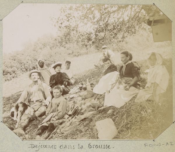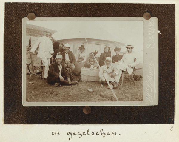 Editor: This albumen print, "Reisgezelschap voor een tent in Syrië" or "Travelling party in front of a tent in Syria", was captured in 1898 by Johannes Lodewijk Heldring. The sepia tones give it such a nostalgic, almost dreamlike quality. What strikes me most is the group gathered so formally in such a barren landscape. How do you interpret this image, what meanings do you find layered within it? Curator: For me, this image is rich in the symbolism of its era, reflecting a particular kind of colonial gaze. The tea set, the meticulously arranged group…it all speaks to a very deliberate construction of 'civilized' identity being projected onto a foreign landscape. Editor: A construction? How so? Curator: Notice how the clothing contrasts sharply with the surrounding environment, and the positioning of the subjects? The figures almost seem superimposed on the land. The objects—tea set, travelling trunks—carry the weight of cultural baggage, defining the travellers' sense of self within a foreign land. They become icons of a very specific kind of belonging. Editor: So, you're suggesting the very act of staging this photograph is a way of asserting dominance, almost planting a flag, through symbolic means? Curator: Precisely. The photograph captures more than just a scene; it encapsulates an entire ideology, a cultural imprint on the Syrian landscape. Ask yourself, how much of the 'Syria' do you see, and how much of a Western theatre? Editor: I see. Now, I'm beginning to understand how the symbols within the image—even something as simple as a cup of tea—can hold so much historical and psychological weight. I hadn't thought of it in that way initially. Curator: Indeed. It’s a reminder that images, like this one, are never simply records; they are powerful conveyors of memory and cultural identity.