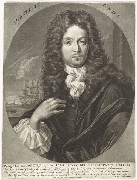 Curator: This is "Portret van de predikant Johann Heinrich Caulius," a Baroque engraving made sometime between 1670 and 1713 by Pieter Schenk. It's part of the Rijksmuseum's collection. Editor: My first impression? Quiet dignity. The monochrome palette concentrates the eye, doesn't it? Curator: Absolutely. Schenk has crafted an image that resonates with the gravitas expected of a clergyman. The use of engraving, as opposed to another medium, suggests a permanence and solemnity, reinforcing the status of the subject. Notice the deliberate composition. Editor: Yes, the oval frame contains the figure, adding a layer of formality. What symbols stand out for you? Curator: The hands are quite evocative, gently resting as if imparting wisdom. It subtly conveys his role as a guide and mentor. Furthermore, consider the turbulent Baroque era from whence it originated, full of political and spiritual conflict, to get the full import. Editor: And look at the light play—careful hatching gives his robe volume, while emphasizing the textures in his rather ornate wig. What psychological layers do you perceive beneath that controlled surface? Curator: I sense an underlying seriousness, but also a weariness. Serving as "advisor" requires bearing weighty issues, doesn’t it? The downward glance and slight furrow in his brow, suggests he is constantly engaged in sober consideration. Editor: So much character conveyed through careful control of light, shadow, line. Schenk created an enduring record using a rather humble print. Curator: The impact extends beyond the personal; the Caulius family name meant something in that period and geographic region. The image would carry historical, social, and personal memories, continuing far into our own present day. Editor: Fascinating!