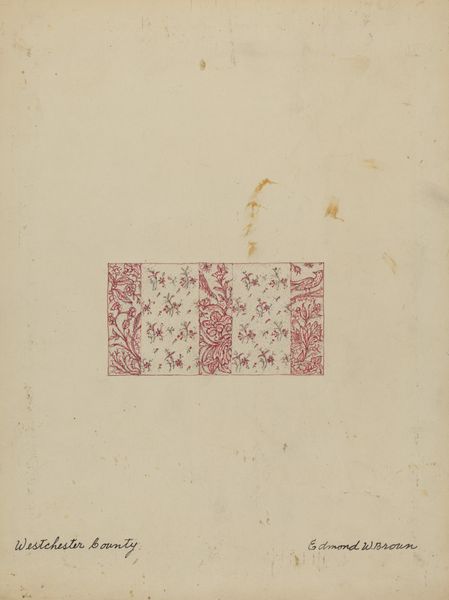 Curator: Welcome! Today, we are examining Francis Law Durand's "Quilt Patches" created in 1937 using watercolor. Editor: Immediately, the charm strikes me. The work exudes a sense of homespun comfort and echoes domesticity. The arrangement is so simple; almost a mood board of swatches. Curator: Indeed. Let’s consider that the artwork, through its careful arrangement, spotlights different textures and designs employed in quiltmaking, a communal folk-art process often tied to storytelling and cultural preservation. Each fragment shown could symbolize specific family histories. Editor: It is interesting how this elevates textile remnants to almost talismanic objects; each color, pattern, and stitch echoing a human story beyond the merely decorative. Observe how those floral patterns in patch number two bring notions of growth and renewal. Curator: Good point. Quilting inherently connects generations, recycling both materials and stories. The materiality is essential: imagine these patches pieced together, worn from handling and imbued with the collective efforts of women during a particular period. Editor: Consider that central lower swatch, the one with the apparent quilting stitching. That simple set of diagonal running stitches creates structure for warmth, not only on a literal level but as metaphor as well, as women and mothers create safe and secure places of retreat in the family household. Curator: Precisely. It represents the work—often devalued or erased as "women’s work"—of maintaining and comforting others. The "drawing" label feels so limiting here—this object is all about embodied labor. Editor: Yes! There is a poignant nostalgia embedded, a celebration of traditional craftsmanship, but also an underlying reminder of human labor in shaping a softer life and culture. Curator: And as a historical artifact, "Quilt Patches" provides valuable insights into material culture during its time, capturing accessible forms of creativity. Editor: A lovely conversation. We see through art history that the ordinary has beauty when interpreted by skilled artists such as Francis Law Durand. Curator: A perspective emphasizing the cultural meaning and process of creating art, exactly. Thank you!