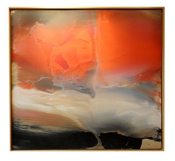 Curator: Here we have Helen Frankenthaler’s "Adirondacks" created in 1992. It’s an abstract painting employing matter-painting techniques and oil paint to stunning effect. Editor: Wow. My first thought is this could be fire viewed from some great distance. The intensity of that yellow contrasted with the heavy dark band above... there's definitely a primal energy at play. It also strangely evokes Mark Rothko. Curator: It’s fascinating that you mention Rothko. While Frankenthaler shares some aesthetic territory with Rothko, especially in the use of color fields, her technique really sets her apart. Do you notice the textured surface? That's part of the "matter-painting" aspect; it lends a tactile, almost sculptural quality, adding depth and dynamism absent from Rothko’s more smooth color surfaces. Editor: Good point. There is a roughness and grit to this piece absent in the artworks of Rothko that encourages curiosity. What kind of visual weight did the Adirondacks have in 1992? Do you know if Frankenthaler often sought a way of expressing natural forms abstractly through intense color and materiality? Curator: Absolutely. Frankenthaler often referenced nature, transforming landscapes into lyrical color arrangements, that was a through-line for her work. The Adirondacks themselves carry symbolic weight, historically representing both sublime wilderness and recreational escape for Americans. Frankenthaler captures a unique juxtaposition between freedom and constriction as a form of sublime expression, where natural elements combine with modernity to represent our collective cultural memory. Editor: Interesting, there are those odd flecks of turquoise amid the reds, which give an unusual dynamism to what could otherwise be perceived as a static arrangement. So it is possible for our collective history to represent the relationship between nature and freedom in a landscape—not unlike looking through someone else’s memory as their psyche navigates new emotional realities through intense color expression? Curator: That is one valid point! Editor: In some sense, this viewing reminds me of poetry or literature whose meaning is interpreted according to who is reading or engaging with it. What an evocative painting!