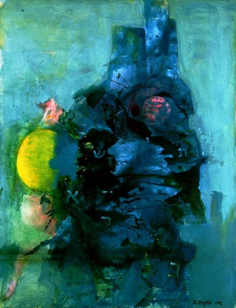 Editor: Alexander Bogen’s “Black Blot,” painted in 1991 with acrylic on canvas. It feels…ominous, a bit chaotic even, with that heavy black form dominating the composition. I wonder what it means? How do you interpret this work? Curator: Ominous is a good word for it! I find myself drawn to the tension between that dense black and the almost vibrant blue surrounding it. Think of it as a kind of psychic landscape – a visual poem, perhaps about confronting the unknown. Look at the way the blue seems to almost push back against the black. Do you see that? Editor: I do! It’s like the blue is trying to contain the black, but it can't quite... Curator: Exactly! Maybe Bogen is exploring internal conflicts? Or even a wider historical struggle to control chaotic forces, painting this in 1991 so close to the collapse of the Soviet Union, is interesting don't you think? The bold color creates some energy within what might have just been depressive dark painting. Editor: So, the "blot" could symbolize turmoil, while the blue represents the struggle to maintain order? Curator: That’s a way to think about it. Or perhaps a memory from his childhood? Editor: Hmm…I was so focused on the blot itself. Considering Bogen's personal experiences adds another layer. Thanks! Curator: My pleasure. These paintings, though dark at times, offer little moments of freedom that keep my curious mind thinking. It makes you think how the smallest of actions can impact the deepest moments of contemplation.