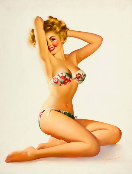Editor: Here we have Robert G. Harris's 1959 story illustration, "The Lady Changed Her Style," likely created with acrylic paint. I'm struck by the dynamic pose of the woman and the very… shall we say… noticeable gaze of the man behind her. What’s your take on it? Curator: Well, consider the date – 1959. This piece acts as a fascinating snapshot of shifting gender roles and expectations within that era. On one hand, the woman’s revealing attire and confident stance embody a certain liberation. But, when we analyze the man's slightly judgmental expression and the leering figures in the pool, can we view that as societal anxieties around female agency, perhaps even ownership over her own body? Editor: I hadn't really thought about the social commentary; I just thought it was a fun, pin-up style piece! So, are you saying Harris' intention might be less celebratory and more… critical? Curator: It's complex. Illustrative art often serves multiple purposes. He's selling a story, yes, but as an image within a magazine, the painting is embedded in this push and pull between empowerment and the male gaze, so do we see him challenging or reinforcing that dynamic? The male figures submerged while focused on her body reinforces how complicit social structure maintains sexism. Editor: That’s really insightful. Looking at the bright colors now, it's harder to ignore the undercurrent of objectification alongside what seemed, at first glance, to be lighthearted fun. It seems to encapsulate this push and pull. Curator: Precisely. It urges us to consider how seemingly simple images are loaded with ideological weight and contribute to broader conversations about gender, power, and representation. We can't separate the artwork from these critical socio-political debates. Editor: I'll definitely look at art with more of a historical and theoretical lens. Curator: Absolutely. Once you're able to put this into perspective, there's a potential in all visual media for positive dialogue!