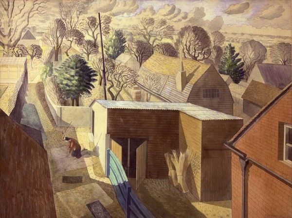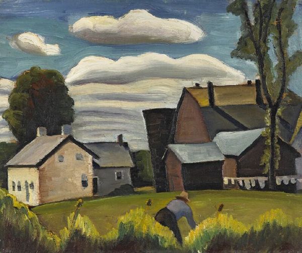 Curator: I find the swirling forms and slightly unnatural palette quite striking; there’s a tension between representation and stylized abstraction at play. Editor: Indeed. We’re looking at Thomas Hart Benton’s “Martha's Vineyard,” circa 1925, rendered in oil paint. For me, what jumps out is the evident physicality of the oil paint itself. You can practically feel the artist manipulating the material to sculpt the landscape. Curator: Precisely. The handling of the paint, particularly in the rolling hills and the swirling clouds, feels almost sculptural, underscoring the materiality of the landscape itself. One thinks of the artist as a laborer wrestling with earth. Editor: And that labor extends beyond the artist's studio, doesn't it? The subject matter—a somewhat domesticated landscape—hints at human interaction, the mark of inhabitants on the land. Even the telephone pole feels like a commentary on how industry shapes our engagement with nature. Curator: True, the telephone pole and structures denote the influence of infrastructure and the impact of development upon rural settings. But formally, consider the sinuous line that carries your eye up and over the hill – the curving path contrasting the angular house; it presents visual dynamism! Editor: Yes, it is dynamic. But consider who exactly gets to retreat to these settings! Regionalism in art, as often displayed by Benton and his peers, serves to reinforce myths of ideal American life in times of crisis, and also masks the realities of marginalized groups outside such places of economic privilege. Curator: That is important context. It’s easy to be seduced by the pastoral ideal that’s rendered on the canvas, however this idyllic visualization requires critical analysis beyond a solely visual reading. Editor: Agreed. Considering it through the lens of material production and social messaging unveils layers that pure aesthetics might obscure. Thanks, I see this oil painting more critically, as Benton surely aimed to be viewed himself. Curator: And for me, your material reading brings an important added understanding. Now that I've spent time considering these factors, I too notice much more detail to absorb!