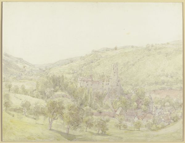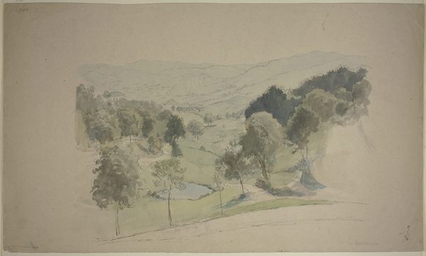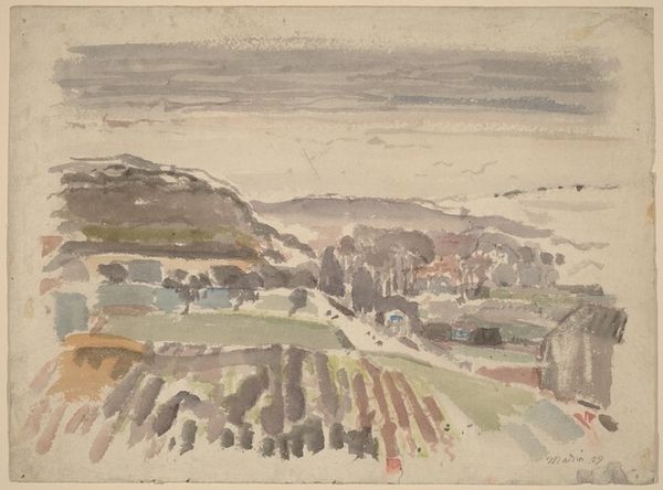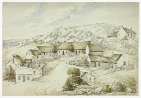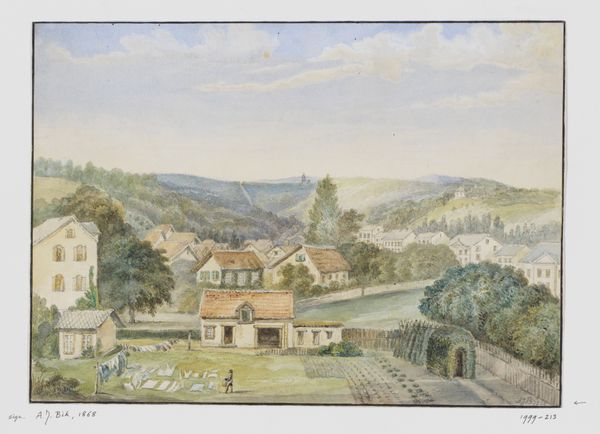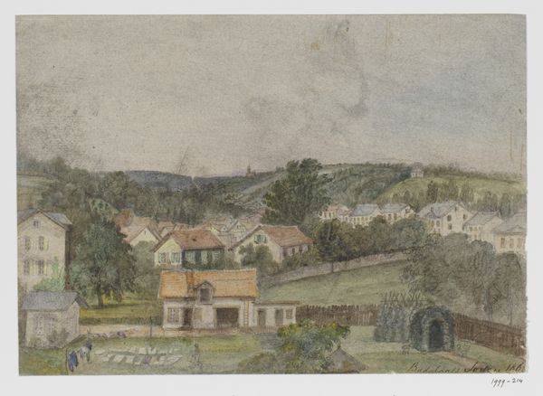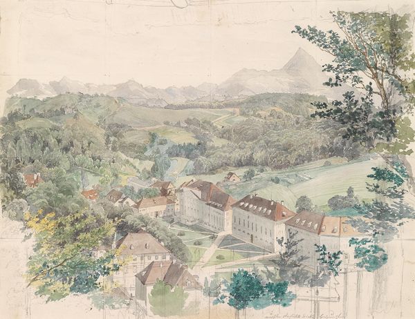Editor: Here we have Johann Nepomuk Passini’s 1848 watercolor, "Im Tal Von Bad Rohitsch-Sauerbrunn," a tranquil scene painted en plein-air. It feels very serene, with the soft colours and the way the buildings nestle into the landscape. What do you see in this piece? Curator: The formal elements dictate my interpretation. Observe how Passini articulates space, using a layered composition, where the interplay of light and shadow across the scene generates depth. Consider also how the structure, from foreground to the distant hill, is a careful orchestration of shapes and lines. Editor: It's interesting how you point out the layering. I hadn't consciously noticed how carefully the different planes were constructed. But what about the mood of the artwork? Doesn’t that contribute to its overall meaning? Curator: Mood is secondary. The artist manipulates medium—the fluidity of watercolor—to achieve texture. Notice how controlled washes contrast with more vigorous brushstrokes. It's not merely a depiction; it's a study of the very nature of painting. What function, in your view, do the colours serve here? Editor: Well, the muted tones seem to create a sense of unity. They also contribute to the calm, almost melancholic, atmosphere. It's all very subtle, nothing is jarring. Curator: Precisely! And it is this subtlety, born from considered compositional decisions, which yields a visually cohesive and thus formally 'successful' work. Editor: I see what you mean. By focusing on the composition and use of the medium, you gain a deeper understanding of the artist's intentions and achievements. I appreciate your perspective! Curator: And I trust my perspective may have opened avenues in which to hone your own analytical reading of artworks.