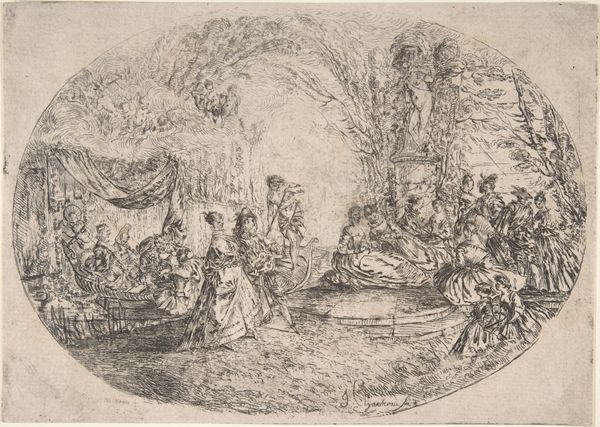 This is "Banquet in the Park of a French Castle," an engraving by Master HS. The composition is a masterclass in controlled chaos, alive with detail and texture, all rendered in monochromatic lines. Notice how the eye is drawn to the central round table, a focal point surrounded by figures engaged in various states of revelry and repose. The structure is densely packed, but the artist uses contrasting patterns to differentiate between planes. The foliage and architectural elements in the background create a tight framing, focusing our attention on the banquet itself. The scene is a study in social dynamics; figures interact in complex relationships with each other across the space. This dynamic interplay is underscored by a visual tension between the refined aristocratic setting and the implicit suggestion of disorder. The dense arrangement of the engraving creates an intriguing, almost unsettling effect, destabilizing our expectations of a harmonious social gathering.