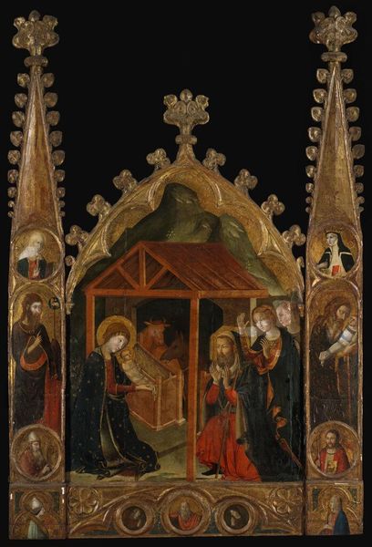 Bernardo Daddi created this "Madonna and Child Enthroned with Saints" probably in the 14th century using tempera and gold leaf on wood. The work's visual impact resides in its architectural structure and rich gold background, which creates a hieratic, otherworldly atmosphere. The Madonna and Child are centrally placed, flanked by saints, forming a symmetrical composition, emphasizing stability and order. The gold ground flattens the space, typical of the medieval aesthetic, which prioritizes symbolic representation over naturalistic depth. The contrasting colours of the figures' robes—deep blues, reds, and yellows—against the gold, creates a visual hierarchy and draws the viewer's eye to key figures. Daddi's choice of materials, particularly the gold leaf, serves not only as decoration, but also to denote sacredness, reflecting the divine status of the figures depicted. The work functions as a signifier of religious authority and spiritual transcendence, employing a complex interplay of colour, line, and material to convey its message within the cultural and philosophical context of its time.