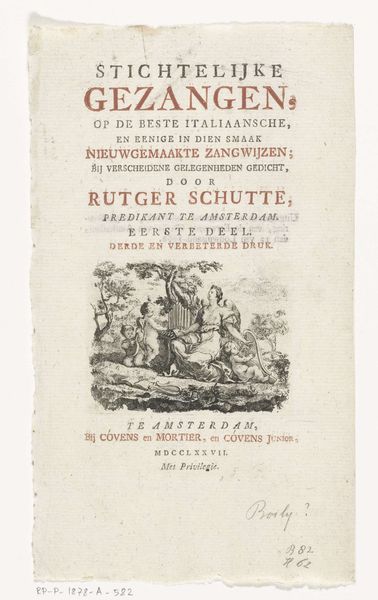 Curator: The piece is a 1753 engraving titled "Riviergod en een putto met boeken" (River God and a Putto with Books) by Monogrammist VD. It looks like it could have been a book cover of some kind. There's an aged quality to the paper and the typography is so precise. It's beautiful, but what do you make of it? Editor: The figure of the river god feels very classical, while the putto is pointing to a shield. Do you think the shield could represent the city? And the god is there for a river. What would you focus on if interpreting its imagery? Curator: I see that, yes. And considering its time, there's likely more going on here. River gods often embody the character and prosperity of a place, so tying him to architectural knowledge – *bouwkunde* – through the putto… Do you see how this suggests civic pride, and links local identity to reason and progress? Notice that there is an attempt to improve on what mistakes happened in the past in architectural knowledge. Editor: I hadn’t thought of it like that. So the image is about linking Rotterdam to wisdom and improvement, as the text reinforces the same goal of betterment. It is definitely Baroque in that respect, wanting to persuade with every detail. It seems more complex the more I look. Curator: Precisely! Even the "koperen platen" – copper plates – mentioned below Willem de Jong’s name, signify not just a technique, but a commitment to accuracy and quality, which ties into this drive to achieve *zuivere waarheid* - pure truth. That’s an aspirational statement of artistic and civic value. Editor: Looking closely reveals so much about cultural priorities beyond just the artistic technique. Curator: Agreed. It’s like uncovering a hidden language of symbols and values, isn’t it? This has made me realize it is a way of seeing Rotterdam. Editor: Exactly! It all becomes much richer! Thanks!