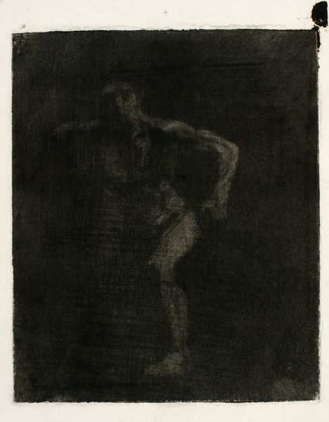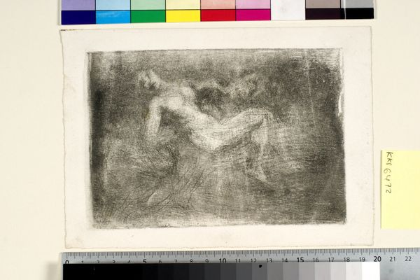Curator: Looking at this ethereal piece, "Zephyr bortfører Psyche," which translates to "Zephyr Abducting Psyche," was completed in 1909. It's a print made with aquatint techniques, drawing and charcoal, by Oluf Hartmann and part of the collection at the Statens Museum for Kunst. Editor: Woah, that's a lot. My first thought? Dreamy, almost hazy. It’s like seeing a half-forgotten memory rendered in charcoal. Are those figures floating or falling? There’s such a weightlessness to the composition. Curator: Indeed, the ethereal quality is prominent, in the symbolism style. Hartmann depicts a classical subject, referencing the Greek myth of Psyche, abducted by Zephyr, the god of the west wind. The choice of aquatint gives the image a soft, atmospheric effect. Editor: It really does lend that "dream state" feel to it. And "abduction" is quite dramatic, isn't it? What strikes me is Psyche seems...almost relaxed. Not struggling or terrified, just drifting. Perhaps it speaks to her acceptance, or destiny. There is a certain intimacy too; almost romantic in mood, yet... it makes you question what has really occurred in the original telling of this story. Curator: That ambiguity might be deliberate. Symbolism often explores psychological states rather than literal narratives. The art movement of the time offered artists like Hartmann to investigate the realm of emotions and explore deeper meaning, hidden underneath well known themes. The viewer is left to interpret Psyche's state of mind, focusing not on action, but internal response. It challenges traditional notions of art, doesn’t it? Editor: Absolutely! And the limited palette—that smoky charcoal— it emphasizes the intimacy, too, as if this dramatic moment is just between them. It avoids so much overt sentimentality or melodrama because you’re focusing only on shape and shadow and this story about transformation, inner conflict, human relations, which, in a way is more resonant to viewers as well. Curator: It’s a work that continues to resonate because it embraces the ambiguity of human emotion, challenging the role of imagery, moving beyond simple representations and provoking more deeper understanding about complex history through modern interpretations. Editor: Yeah, and even today, those murky depths offer a space where our own personal narratives and feelings about love and trust get mixed with the mythological. That's the magic right there, I think.