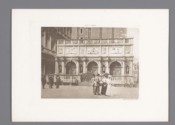 Editor: Here we have Willem Frederik Piek Jr.’s photograph, “Menigte voor het bordes van het stadhuis van Gouda, excursie van de Openbare Handelsschool”, created sometime between 1889 and 1893. The sepia tone lends it a sense of aged formality. I’m struck by how the composition leads your eye upward to the stark facade of the building. What catches your eye in this image? Curator: I am immediately drawn to the subtle play of light and shadow across the architectural forms. Consider how Piek utilises the inherent tonalities of the photographic medium to delineate the building's features – the balustrade, the windows, the entryway – with such nuanced gradation. What semiotic relationship exists between the group of figures gathered on the steps, and the implied power or permanence of the Gouda Stadhuis? Editor: I see what you mean; the figures seem dwarfed. The details of their faces are soft but I observe that they are not as firmly represented in the composition, whereas the structure in the backdrop holds a stronger, prominent position. Why might the structure hold prominence here? Curator: Perhaps it highlights the school's relation to civic institutions, reinforcing values of hierarchy and authority. The carefully composed lines direct our vision; notice how Piek guides the gazes via the vertical and horizontal axes of the construction itself? Observe the lines traced in the facade, consider them as methods to understand the organization of space. Editor: It’s interesting how focusing on composition shifts the interpretation away from just being a record of a school trip. Are the soft-focus details and faded colour part of its intended structure? Curator: Precisely! This artistic choice is not merely representational; it encourages a discourse concerning memory, distance, and even the conceptual dimensions of early photography as a fine art medium. In sum, the effect transcends representational purposes. It moves beyond simply capturing; it’s about crafting a specific encounter between the viewer and architectural essence. Editor: That’s a new way of considering photographic intentions, I had always presumed photographs to be more or less direct records. I’ll be sure to re-examine them now in terms of composition! Curator: Indeed, the photograph becomes a space where forms, lines and tones convey complex visual information. A successful semiotic endeavour, I think.