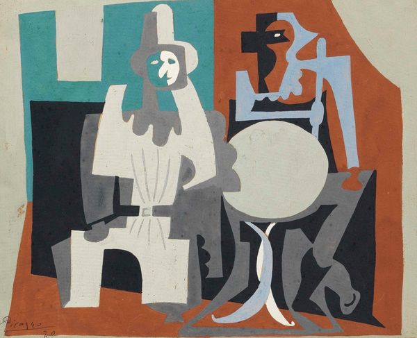 Curator: Alexander Bogen's 1970 mixed-media work, "The Holocaust," compels us to confront one of history's darkest chapters. Editor: My immediate response is to its somber, almost oppressive atmosphere. The muted colors, fragmented figures—they evoke a sense of profound unease and suffering. Curator: Absolutely. Bogen, a Holocaust survivor himself, wasn't interested in simple representation. His expressionistic style and the use of figuration serve to portray the psychological trauma and social devastation. Note how the narrative art operates— Editor: Excuse me, but I must observe that these stylized shapes are positioned rather like components of architecture—massive slabs that recall not figures but mausoleums. Semiotics would suggest they embody unspeakable loss. Curator: Yes, the shapes suggest enclosure, and indeed Bogen uses a palette reminiscent of shadows, of absence, to emphasize not only physical death, but the erasure of identities, cultures, and futures. It begs questions: who are these people? How were they forced to face displacement and marginalization? Editor: True, although what speaks to me most profoundly is Bogen's handling of scale. Observe how he positions objects so that we grapple with the emotional weight embedded within their forms. Those pale individuals, each with uniquely grief-stricken gestures, serve almost as hieroglyphs expressing utter powerlessness. Curator: Right. Powerlessness born of institutional failure. Bogen implicates society—he confronts us with the structures and beliefs that allowed such atrocities to occur. Even his medium, that mixed concoction of pigment, allows a blending of horror, reflecting the blending and obliteration of personal histories that took place. The canvas, then, almost operates as both memorial and warning. Editor: Ultimately, Bogen seems less concerned with historical accuracy than with communicating visceral feelings using compositional cues: asymmetry; abrupt shifts of plane and color, with a deliberate distortion of form to intensify our empathic engagement. Curator: A painful but vital act of memorialization, and indictment. Editor: And, in its unique style, a chilling testament to the potency of formal pictorial construction.