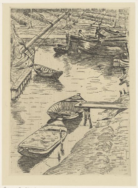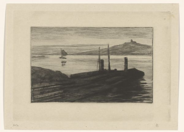Editor: This is "Zeegezicht met pier bij Cuxhaven," or "Seascape with Pier at Cuxhaven," an etching by Carel Nicolaas Storm van 's-Gravesande, created sometime between 1851 and 1902. It feels so bleak, almost melancholic with its grays and the suggestion of industry meeting the sea. What strikes you when you look at it? Curator: The etcher’s skill in depicting atmosphere, in suggesting the industrial development within a traditional marine setting, that’s what grabs me. I’m particularly drawn to considering whose stories are validated, and whose are suppressed. It also brings to mind how artistic communities interacted and were affected by broader sociopolitical changes. It's hard not to view this without considering that pier as representative of expanding trade and the rise of the middle class. Do you think its presentation in the Rijksmuseum might give it a certain weight or authority it might not have had originally? Editor: That’s fascinating. It certainly changes my perspective, thinking about the museum's role in shaping our understanding of the piece, but why do you think that trade expansion is relevant here? Curator: Consider where this piece resides and what it implies. Museums select, interpret, and frame narratives for public consumption, often solidifying a certain political position or national identity. In this case, we may have to examine the rise of Dutch mercantile power in the 19th Century, including a potential association with colonial enterprises and emerging national identities. Does this etching endorse that political message, or perhaps offer a more ambivalent commentary? The setting seems somehow both romantic and polluted, don’t you think? Editor: It does! The smoke adds to the gloom, which does make you wonder if it is a celebration or a critique. I see it differently now. Curator: Indeed, viewing it within an art historical frame enriches our experience. This piece urges us to probe at the subtle interplay between the artistic expression and sociopolitical currents that sculpted not just the artwork, but its evolving significance.