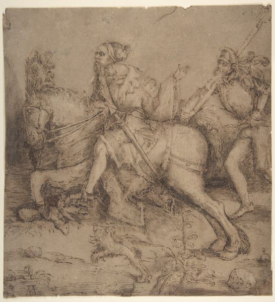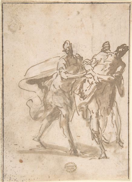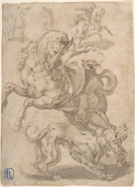 Editor: We're looking at Carlo Urbino's "Saint George and the Dragon," an ink, chalk, and pen drawing on paper. There's a raw energy to it, like a snapshot of chaos right before order is restored. It's messy, immediate, you know? What do you see in this piece, something that maybe I’m missing? Curator: "Messy, immediate"—yes! It's the beauty of the sketch, isn't it? Consider that it's not just a history painting but a story—the underdog standing up to monsters, real or imagined. It embodies this feeling of good conquering evil, or the reverse perhaps if we think a little further… What does Saint George truly gain from slaying the dragon, I wonder? It is really "good" winning, or is something of deeper significance occurring? Editor: I hadn’t thought about it that way, as maybe some kind of loss, actually! I was so caught up in the action, in the visual of the struggle, that I completely overlooked any potential nuance in George's victory. Curator: Urbino’s style almost amplifies this complexity for me. It's medieval, right? But something in his swirling, energetic strokes hints at a breakdown or reevaluation of old heroic tales, almost making you think, is our hero sure about this victory? And how will it impact his future and the future of the person looking on? Editor: I see what you mean. It's not static, it feels unresolved somehow. Maybe a bit dangerous even? Curator: Exactly! So, this wasn't just practice, it's a little meditation. Editor: A medieval tale with modern questions; I definitely see that now. Curator: Precisely! It’s a testament to art’s incredible capacity to bridge the past and present.