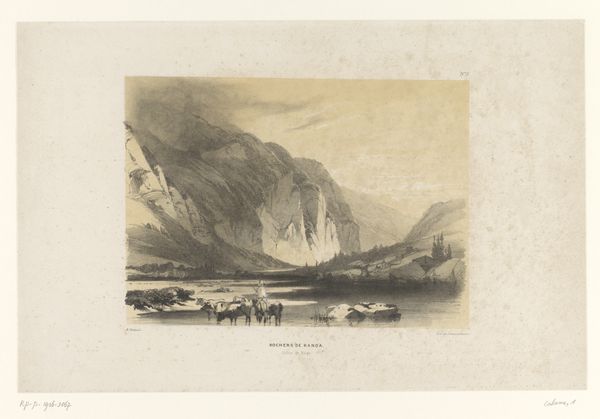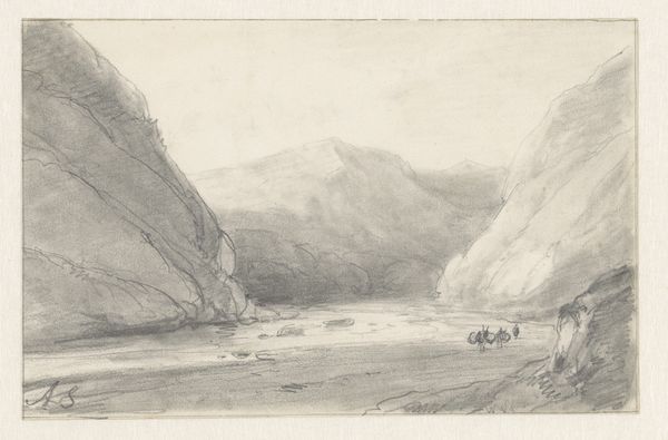 Editor: So, here we have "View of a High Rocky Coast, with a Fortress on One of the Summits," created in 1860 by Johannes Hilverdink. It's a drawing using ink, charcoal, and watercolor, currently housed in the Rijksmuseum. What strikes me immediately is the imposing, almost melancholic mood, a kind of silent grandeur. What do you see when you look at this work? Curator: I'm immediately drawn to the tension between the imposing fortress perched atop the mountain and the chaotic energy of the sea below. That contrast speaks volumes, doesn’t it? Editor: It does. What volumes do you hear? Curator: Think of the Romantic era, with its fascination for sublime landscapes and the power of nature. That fortress is more than just a military structure; it’s a symbol of human ambition, of control imposed onto an untamable world. The waves crash relentlessly; what does that imply about the staying power of humankind and its symbols? Does the fortress offer protection or is it isolated, vulnerable? Editor: That’s fascinating. It feels like it's not necessarily about physical strength, but more about the psychological weight of trying to dominate something inherently uncontrollable. It suggests a very fragile sense of power. Curator: Precisely. And the use of muted tones contributes to this feeling of transience, as if even stone and ink are subject to the same eroding forces as everything else. What enduring ideas can come from it, then? Editor: It makes me rethink the very idea of monuments. I often view monuments as evidence of cultural pride, but, as you point out, this drawing suggests that everything eventually yields to nature. Curator: Exactly, it causes one to consider humanity’s legacy, and perhaps inspires us to build for harmony rather than dominance. Editor: Well, that's given me a lot to consider. I appreciate you illuminating what this image suggests!