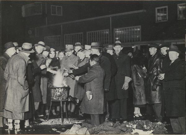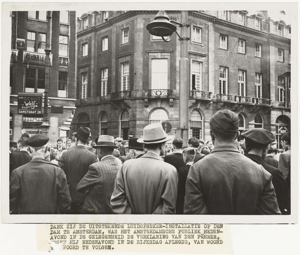 Curator: This is Don McCullin's "West Berliners Looking East." Editor: It's a study in gray tones; so many textures, a melancholic feel given the uniformity of color. Curator: It encapsulates the divided city. The composition directs our gaze across a crowd to the stark division represented by the Berlin Wall, impacting all sectors of life during the Cold War. Editor: The way McCullin frames the faces, some filled with longing, others obscured, it's a powerful arrangement. A semiotic examination reveals how the architecture contrasts with the softness of the figures. Curator: Absolutely. The photograph documents the human cost of geopolitical conflict, embodying the spirit of resistance and the longing for unity within a divided society. Editor: Yes, McCullin has used light and shadow masterfully to highlight the emotional tone. It’s a poignant depiction of a historical moment, achieved through careful attention to form. Curator: It makes you wonder about the individual stories behind those faces, doesn't it? Editor: Indeed. A successful visual representation of a complex period.
