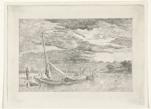 Editor: This is Willem Gruyter Jr.’s "River View with Sailing Ship," likely made between 1832 and 1880, now hanging in the Rijksmuseum. It's a delicate etching; a quiet scene despite the ships. What strikes you about it? Curator: What immediately grabs my attention is the process itself. Look at the lines, the etching, the physical act of creation. Each stroke is a trace of the artist’s hand, and each choice reveals a decision about labor and production. The material, the plate, the acid - all leave their mark. Editor: I see that now, the detail in each individual stroke! But how does that affect the scene itself? Curator: It moves beyond simply depicting a river view. The etching process itself becomes part of the content. Consider the cultural context. Etchings were often reproduced for wider consumption. Were these images aimed at an elite audience, or were they meant to be distributed more broadly, contributing to a shared visual understanding of the Dutch landscape? Editor: Interesting. So you are saying it may be an "everyman" landscape, made using printmaking as a mode of distribution? Curator: Exactly. The lines could indicate how people related to landscape through work, travel, trade... Even the level of the tide and river are indicative of labor. Are these purely artistic explorations, or are they documents reflecting labor, commodity, and value? Consider where he sourced materials and how global trade impacted production. What can this print, with its layered history of material, labor, and circulation, tell us about the larger systems at play? Editor: So looking closely at the materials and process gives us clues to how this image may have played a role in the social and economic landscape of its time. That is pretty mind-blowing! Curator: Indeed, and that’s the fascinating thing about materialist approaches to art history: they encourage us to move beyond just aesthetic appreciation and examine art as a product of labor and social forces.