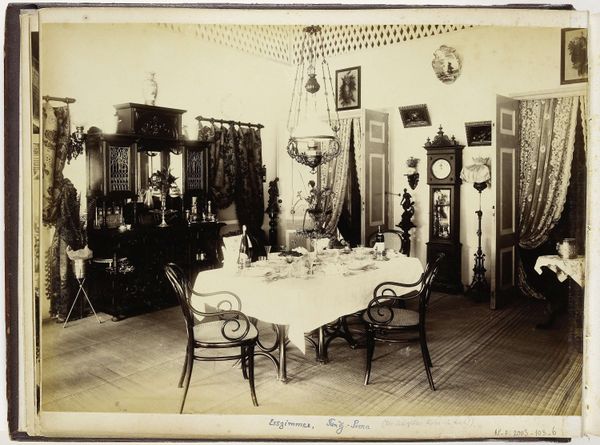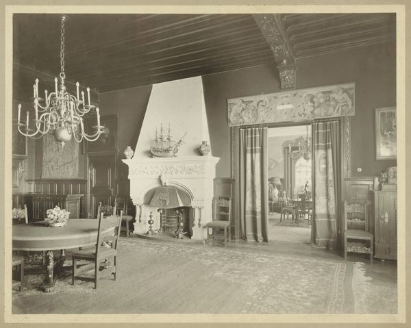 Editor: We’re looking at "Huiskamer in dienstwoning van geneesheer Jacob Evert Wesenhagen," a gelatin-silver print photograph taken between 1900 and 1910. It depicts an interior, likely the living room of a doctor's residence. There's a stillness, an almost staged quality to the scene. What do you make of its historical context? Curator: This photograph is a fascinating window into the social landscape of the late 19th and early 20th centuries. Given the subject matter – the living room of a doctor – how does the composition reinforce or challenge the societal expectations of that time? Editor: I see the attention to detail – the lace curtains, framed portraits – suggesting a desire for respectability and a certain level of cultural aspiration. It’s quite bourgeois, isn’t it? Curator: Precisely! The "Arts and Crafts" movement, with its emphasis on handcrafted items, was a direct response to industrialization. These domestic details speak volumes. Note the strategic arrangement of portraits, books, and even the specific choice of lighting fixtures. How does this constructed domesticity perform for its intended audience? Editor: Perhaps the photo aimed to promote Wesenhagen as not only a skilled doctor but also a refined individual, fitting the cultural expectations. So, this "snapshot" is a consciously curated representation of social identity. Curator: Exactly. It speaks to the growing public role of imagery and how it was deployed to project social standing. We should also consider the institutional forces at play; How might photographic societies or exhibitions of the era have shaped the image's composition and subject matter? Editor: That's fascinating! I hadn't considered the potential influence of photographic societies on the *content* of the photograph itself, beyond technique. Curator: Seeing art within its historical and social context is key. By analyzing images like this, we gain a much richer understanding of our past. Editor: I totally agree! Thanks, it was so much more layered than I initially thought.