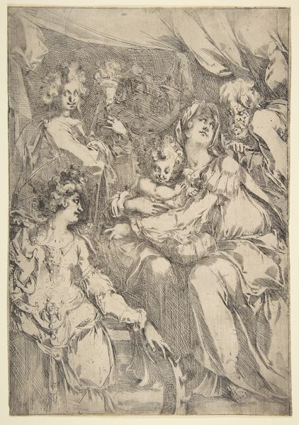 Editor: So, this drawing is called "Studies for the heads of three satyrs, an old man and two women," likely from somewhere between 1525 and 1575. It's ink on paper, and seeing all these heads crammed together gives me this sense of theatricality, almost like a cast of characters preparing for a play. What do you see in this work? Curator: What strikes me is the contrast between the satyrs and the women. We have these wild, almost grotesque figures juxtaposed with what appears to be idealized beauty. It brings up interesting questions about how the Renaissance was defining and reinforcing gendered stereotypes through art. How do you think these images contributed to social power structures? Editor: That's a good point! I hadn’t thought about the power dynamics at play. It's easy to get lost in the technical skill and forget to consider the social context. Were satyrs always depicted so… intensely? Curator: The Renaissance often reinterpreted classical figures like satyrs through a Christian lens, often associating them with untamed desires and the baser instincts of humanity. By pairing these figures with serene, classically idealized women, the artwork might be making an implicit comment on the perceived differences, and perhaps even conflicts, between male and female nature, but were those interpretations shared universally? Editor: I guess I see that tension now. The artist isn't just showing us faces; they're presenting different facets of humanity as they understood it, likely shaped by biases and societal expectations. Curator: Precisely. The beauty of art, even preliminary sketches like these, lies in its ability to reflect and, perhaps unintentionally, critique the social and political landscape of its time. What this drawing reveals, beyond technique, are ingrained ideas about identity. Editor: It's fascinating to consider this piece as more than just a study of form, but as a record of cultural attitudes. Curator: Indeed, a glimpse into the complex interplay between art, gender, and power in Renaissance society.