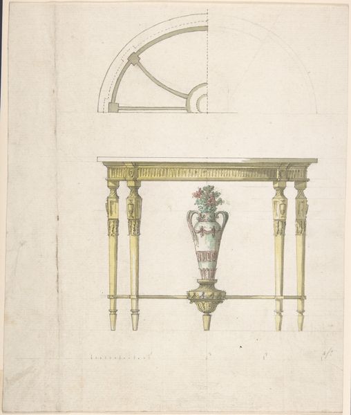 Editor: Here we have Sir William Chambers' "Design for a Pier-glass with Arched Head and Palmette Terminations," dating from between 1743 and 1796. It's rendered in pencil, pen, and print. The symmetry and delicate detailing give it a distinctly formal feel. What sort of meanings do you see embedded in this design? Curator: It’s fascinating how Chambers employs classical motifs in this pier-glass design, isn’t it? Think about the palmette at the apex, and the swag motifs. They evoke ancient Greece and Rome, calling to mind ideals of order and reason. How do you think this visual vocabulary speaks to the cultural aspirations of the Neoclassical period? Editor: I see what you mean, it feels like the design wants to revive a golden age. So is the mirror itself also symbolic? Curator: Absolutely. The mirror doesn’t just reflect an image; it reflects ideals, values, and the status of the person gazing into it. In a Neoclassical setting, it suggests self-reflection, the pursuit of knowledge, and adherence to classical virtues. It becomes a powerful tool for self-fashioning and presenting oneself in a cultivated, enlightened manner. What other details strike you as particularly meaningful? Editor: The garland of leaves makes me think of celebration, or even victory. But how can a mirror design signify victory? Curator: The laurel garland around the arch speaks to a cultivated victory, a triumph of the mind and good taste through the acquisition of knowledge and virtue. A visual link that underscores one's position within a refined, classical milieu. How interesting! Editor: It's amazing how something that seems purely decorative is really loaded with cultural meaning. I definitely see it differently now. Curator: Indeed, a beautiful artifact that prompts us to contemplate the values of a society through the things they create.