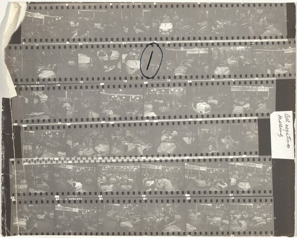 Curator: Today we’re looking at Robert Frank’s “Wales 32,” a contact print from 1953. It presents rows of developed film, revealing his editing process. What's your initial take on it? Editor: Well, it feels like peering into someone's memory – fragmented, layered, and slightly chaotic. The contact print medium is fascinating, since it’s so raw and immediate. The darkroom's decision making is so transparent. Curator: Precisely. The grid format imposed by the film strips creates a compositional tension. The eye bounces between images, searching for patterns or connections across frames. It’s more about process than singular captured image, right? Editor: Absolutely. But the images themselves do resonate. I see recurring motifs: crowds, possibly religious gatherings under these very prominent light sources. The figures seem almost dwarfed by the light, creating a sense of awe or perhaps submission. Curator: It strikes me that the images themselves show an interesting arrangement of dark and light masses within each frame and across the whole. Frank arranges for strong tonal balance. He clearly favored specific frames based on form, but I wonder why... Editor: I see those heavy edits. Those red markings circling specific frames force us to consider which moments caught his eye—and why. They highlight an individual standing alone, set against the crowd, perhaps representing a yearning or quiet dissent? Curator: You know, looking at it this way also draws my attention to the act of selection itself. Frank's marks transform the mundane into something meaningful. The hand of the artist, deciding what merits our attention. Editor: Right. Frank used such symbolism effectively. There's also an element of social commentary here; this tension between individual and crowd, power dynamics and moments of transcendence. What this Welsh community symbolized is still really engaging to think about. Curator: Indeed, and I now understand how these small tonal adjustments create balance that speaks to a deeper symbolic language here. It’s about how visual choices construct meaning. Editor: And about how our interpretation of those forms is always shifting as we grapple with cultural heritage. It truly highlights the layered potential inherent in images, whether as documentation or art.