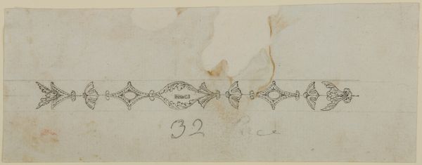 Editor: So, this drawing, "Design for the Decoration of Firearms," by Nicolas Noël Boutet, created between 1772 and 1830, is made with ink and watercolor on paper. It looks delicate but precise. What immediately strikes me is the intricate balance between organic, flowing lines and the geometric potential inherent in the design's repetition. What do you see as key elements in this piece? Curator: Its intrinsic quality resides in the rhythmic interplay of curvilinear forms. Observe how the artist structures space, employing a pattern that alternates between floral and foliate motifs connected by a sinuous line. The compositional strategy highlights a tension: are we looking at naturalism or a structured artifice? Consider the texture of the paper too. Does it create or distract from the overall composition? Editor: That's a good point. The toned paper and slight imperfections do add an element of age and perhaps even authenticity, preventing it from feeling overly polished. It reminds me a little bit of some Art Nouveau designs, but earlier, and intended for weapons rather than architecture or jewelry. Curator: Note, too, the inherent tension created between surface and depth. The application of watercolor, a medium known for its luminosity, enhances the visual texture but does little to disrupt the primarily two-dimensional structure. The artist presents ornamentation, but remains tethered to its literal depiction on a flat plane. Editor: So you're saying that the work doesn't try to trick the eye, instead choosing to call attention to its inherent properties? That makes me appreciate the level of transparency of artistic process and thought here. Curator: Precisely. Understanding the formal construction provides a basis for considering its conceptual implications. This piece compels the viewer to look beyond superficial ornamentation and invites scrutiny of artistic intentions. Editor: It's fascinating to see how a seemingly simple design sketch can be so rich in compositional detail. Thanks for pointing out the visual dynamics.