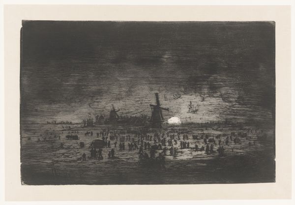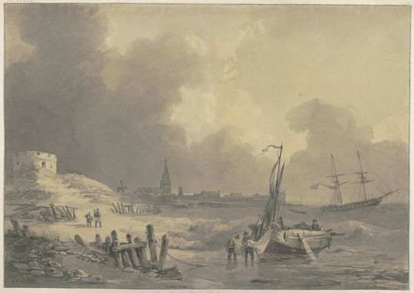 Curator: Looking at this drawing by Jacob Esselens, dating from 1697, entitled "Bonfires on the General Thanksgiving for the Peace of Rijswijk," the first thing that strikes me is its overwhelming greyscale palette. It feels somber. Editor: Somber is an interesting word choice, especially for a work celebrating peace! Though monochromatic, I see so much bustling activity represented by the delicate use of ink and watercolor. Considering the historical context—the end of the Nine Years' War—perhaps Esselens aimed to depict the restrained jubilation of a nation emerging from prolonged conflict. The materials here, ink and watercolor on paper, suggest an immediacy, like a quick, documentary sketch rather than a polished, celebratory painting for the elite. Curator: That's an interesting take. To me, it’s the strategic deployment of light against the darker washes that suggests so much depth despite the modest materials. Observe the way he's captured the luminosity of the bonfires reflected on the water’s surface – masterful technique that makes one forget that the artist's hand shapes the narrative just as much as historical context. The paper itself, and the evidence of drawing over painting implies a more thoughtful and involved artistic labor than merely recording events. Editor: I wonder how accessible these celebrations of peace were to different classes? It looks quite spectacular, judging from the amount of boats and general turnout in the artwork. Surely, there were some groups still marginalized or devastated by war's impact, making universal joy an unlikely scenario, and suggesting this piece potentially serves the powers involved with the peace treaty. How did they produce those dazzling pyrotechnics? Did they hire entire guilds or employ new workers? Curator: We could research guild records and city expenditures for thanksgiving to illuminate where materials were acquired, and explore economic relationships that sustained this artistic work. I do note the intricate detailing of ships and the architectural backdrop indicating Esselens' mastery over draftsmanship as a highly valued skill at that time. Editor: That is indeed valuable knowledge, especially to understand social structures and to acknowledge unsung contributions behind what may seem as fleeting celebrations. Considering that a major war just ended, its legacy probably endured far longer, disproportionately affecting specific groups, especially marginalized populations. These peace narratives frequently neglect to foreground experiences beyond upper classes, even those of the labor required to celebrate it. Curator: The more we examine this scene of public jubilation rendered through layers of diluted ink on humble paper, the more layers it exposes. I hadn’t considered the work that went into it this deeply. Editor: Absolutely. And for me, remembering how power dynamics shift during wars—who profits and who suffers—adds to the artwork’s story that cannot be extracted from materiality alone.