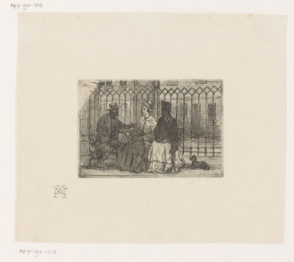 Editor: This is "Praying Women in a Church" by Léon Augustin Lhermitte, created in 1878 using ink on paper. It has a somber and reverent quality that is reinforced by the black and white print. What symbolic weight might the scene of women at prayer carry, culturally or psychologically? Curator: Look at how Lhermitte positions these women. They're clustered together, almost unified in their posture and dress, heads bowed low. Consider what this uniformity represents. Is it a reflection of societal expectations for women of that time, or something deeper, connecting them through shared experiences, perhaps even anxieties or hopes related to faith? Editor: So you are suggesting the picture offers a glimpse into their collective identity beyond just religion? Curator: Exactly. The church itself, with its soaring arch and prominent religious imagery, is more than just a backdrop. It acts as a container, holding these women and their collective consciousness, steeped in historical and spiritual meaning. Does that intense concentration of visual symbols amplify their emotionality, do you think? Editor: It really emphasizes the psychological intensity of shared religious practices and rituals. Also, I notice that one woman kneels in isolation near an altar, separate from the group, praying independently, and that suggests individual, and maybe more private, devotion. Curator: A striking detail. What does that single figure suggest about individual interpretation and negotiation within the bounds of communal ritual? What is her personal motivation? Is she closer to grace, being in a more vulnerable and personal pose? Editor: Fascinating. This discussion opened my eyes to see how faith, gender, and individual agency interplay within such traditional religious settings, and I was completely oblivious before. Curator: Indeed, images invite us to contemplate history not as a mere timeline but as a living dialogue between past symbols and present selves.