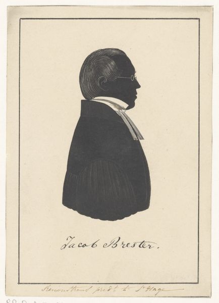 Editor: Here we have Pieter Barbiers' "Silhouette Portrait of Everard Ambrosius Zubli," made sometime between 1809 and 1848. It's a print on paper. It has a stern but very clean aesthetic to it. What stands out to you most in this work? Curator: The seemingly simple silhouette becomes fascinating when considering its production. We have paper, a relatively cheap and accessible material by the 19th century, but transforming it into a likeness involved skilled labor, even for something as "simple" as a silhouette. Who had access to this kind of portraiture, and what statement were they making about themselves through this consumable item? Editor: That's a really interesting way of framing it, not just about likeness, but the context. What was the technique here? Was this silhouette cut freehand, or was it mechanically reproduced? Curator: That's a crucial question. Close examination—the type of paper, the sharpness of the lines—can give us clues. Mass production, even in this early period, would influence the price and therefore, who could acquire such an image. The artist, the printer, and the sitter, Zubli, all participated in this material exchange. And note the handwriting. It adds personality to this seemingly “flat” portrait, making us think of the labor involved in inscribing Zubli’s name onto each of these works. Editor: So even a portrait that feels so... distant... really tells us a lot about society and economics back then. It's about class, access, labor… the materiality makes it tangible. Curator: Precisely. By considering the paper, the printing process, and the hand inscription, we can unearth layers of social and economic meaning embedded within this "Silhouetportret".