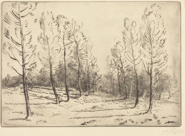 Curator: Today, we're looking at Alphonse Legros' "In the Forest of Fontainebleau," a graphite and etching piece depicting a serene forest scene. Editor: My initial reaction? The density of the lines creates an incredibly moody atmosphere. There’s a real sense of the forest closing in, perhaps even a feeling of melancholy. Curator: Indeed, Legros’ technique here is quite striking. Notice the meticulous cross-hatching and the varying line weights he employs to define the forms of the trees and the foliage. It’s all about structure, the internal logic of representation. Editor: And the social context of the forest is quite potent, isn't it? This forest as both a refuge and a place of alienation, especially in 19th-century France with all its social upheavals. Forests have long been symbolic locations. Curator: Semiotically speaking, consider the stark contrast between light and shadow. This tension creates visual interest but also alludes to underlying oppositions inherent within the scene itself. Editor: This reminds me of Foucault’s heterotopia; the forest acts as its own distinct world within a world, subject to its own rules of light and dark. It allows for subversion or reaffirmation of identities – in other words, the figure may have its being here apart from public gaze. What do you think, what is this solitary figure doing deep inside the trees? Curator: You presuppose a figure is there— the impression may arise as much through formal composition, perhaps playing out psychological interiority rather than social placement. It seems instead to operate through starkness. I would hesitate on ascribing particular motivation. Editor: Still, these quiet etchings force a kind of awareness. There is not an attempt to hide that the work has an effect, it invites introspection of ourselves, while being at the limits. Thank you! Curator: A poignant reminder of the emotional power inherent in carefully observed landscapes, and certainly invites us to view formal qualities in relation to their meaning and construction of reality.